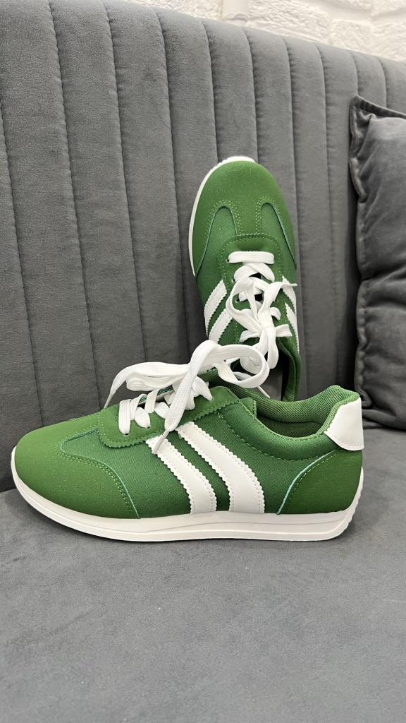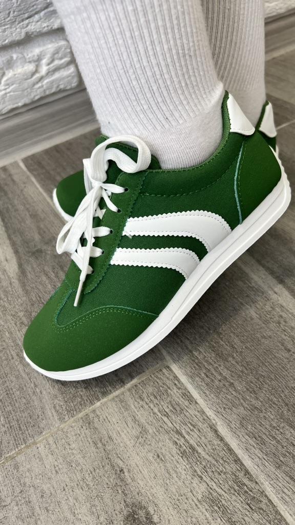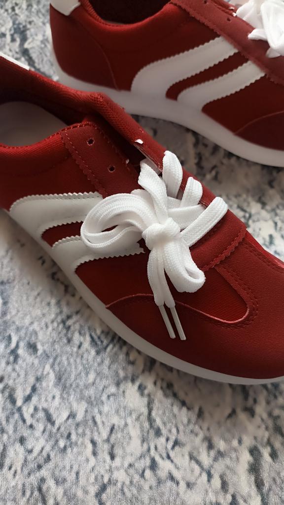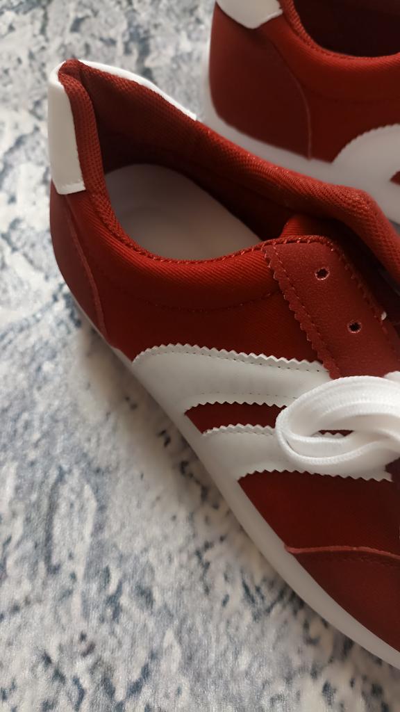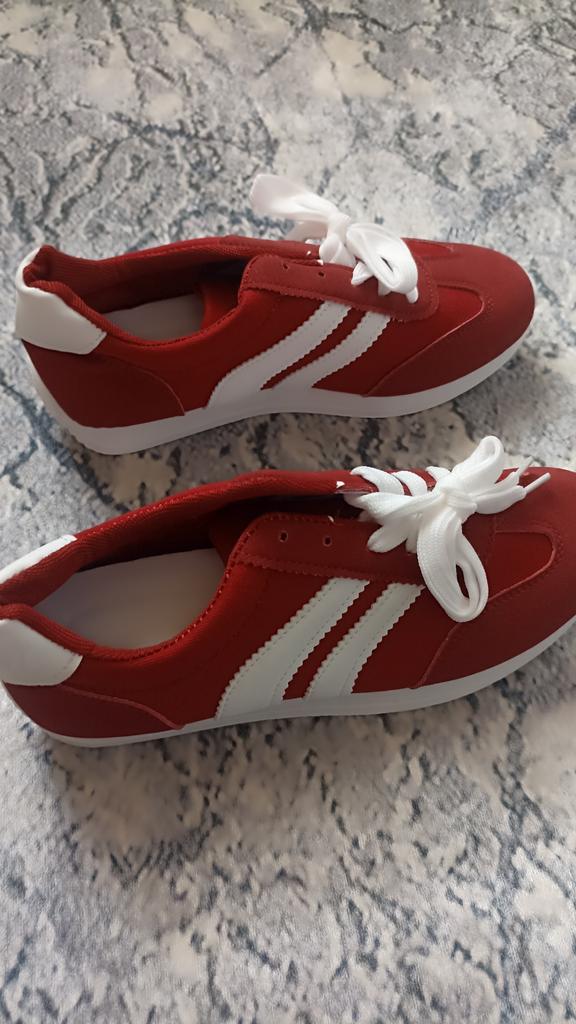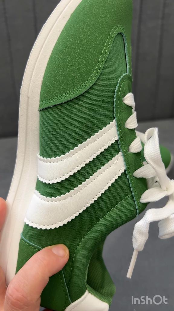 Dámské tenisky. Model tenisek pod značkou. Vypadají velmi stylově a krásně. Svršek - kombinace umělého semiše a textilu + umělá kůže. Pohodlná podrážka. Na výběr jsou dvě barvy: zelená a červená. Rozsah velikostí: od 36 do 43. Byla vybrána velikost 40. Perfektně sedí na chodidlo 25 cm.