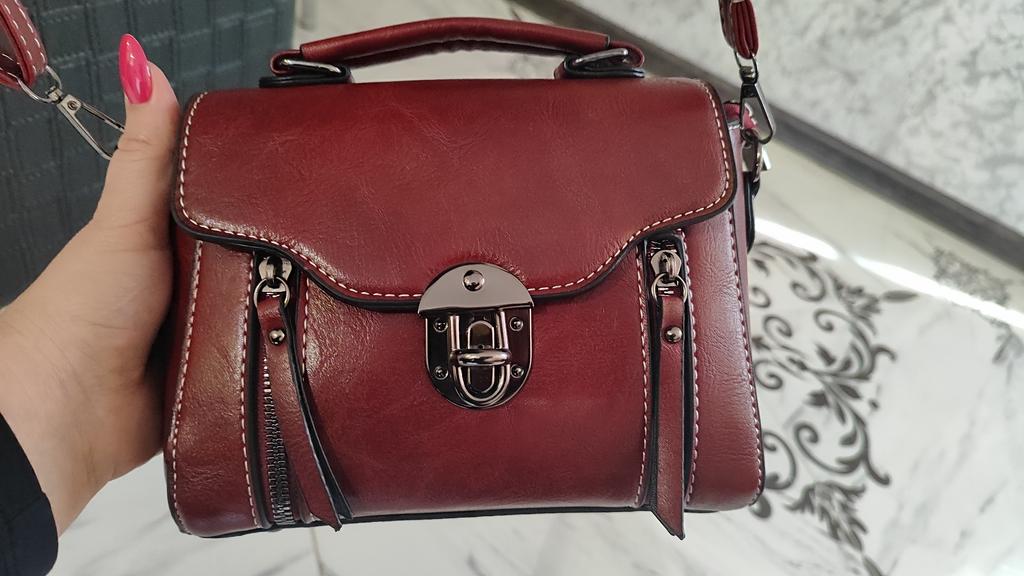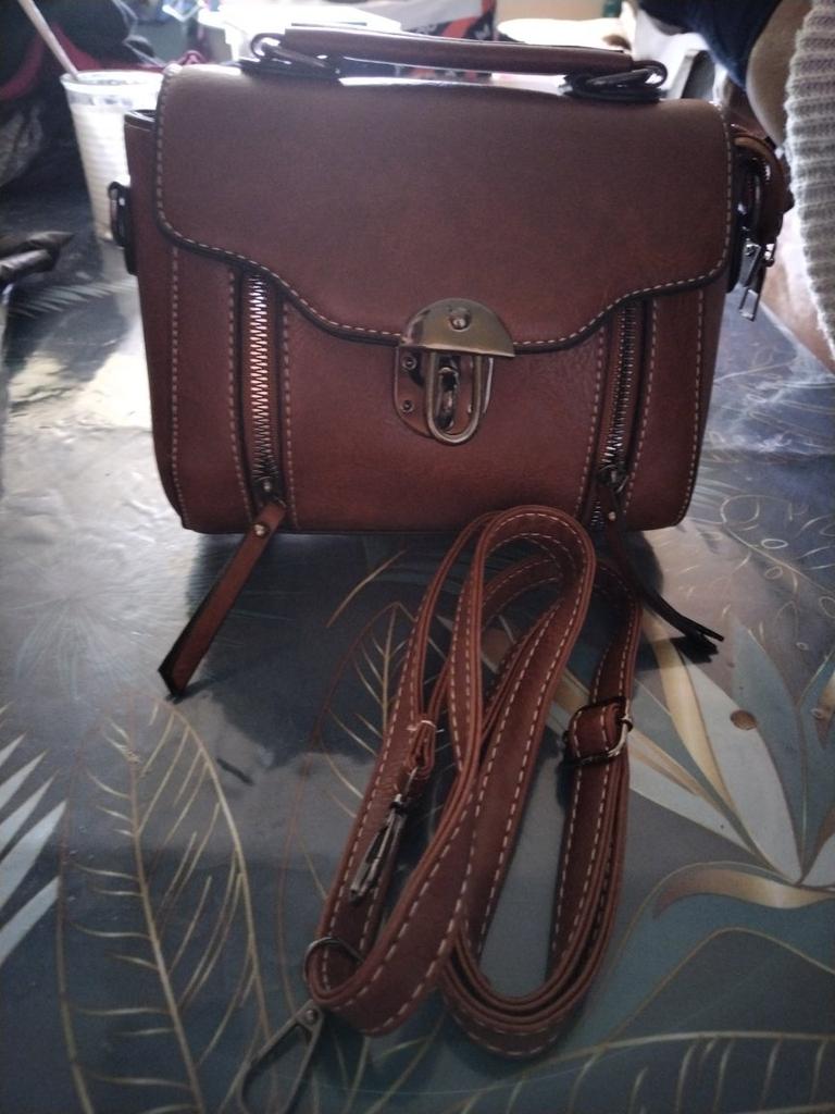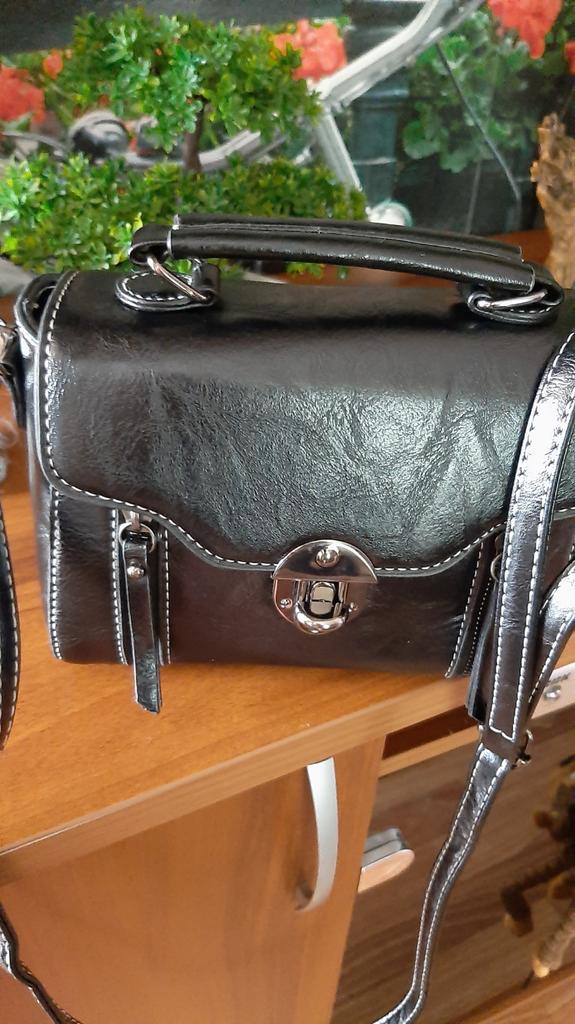 A pretty little handbag. Arrived well-packaged, in excellent condition. It has a short handle and a long strap. Inside, it is divided by a zippered partition, there is a small, open pocket. The external zippers are decorative.