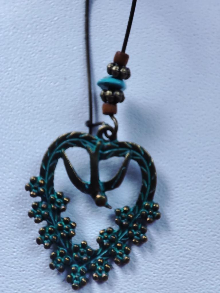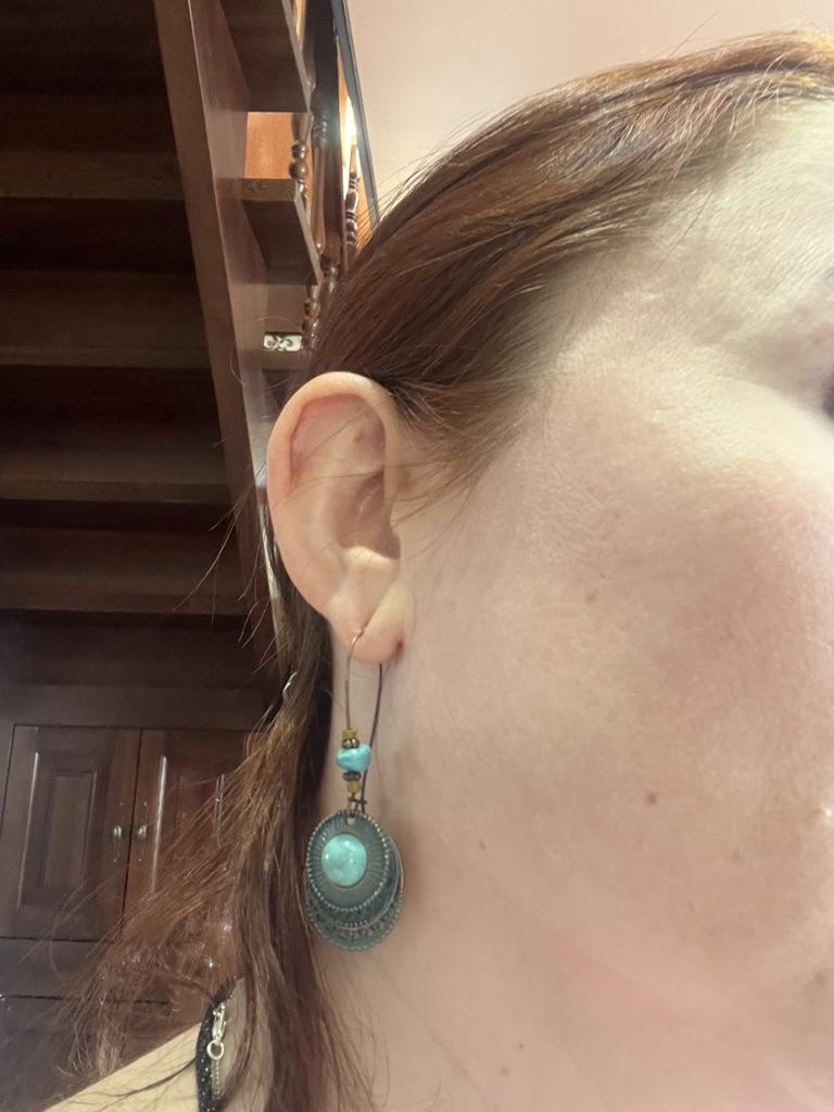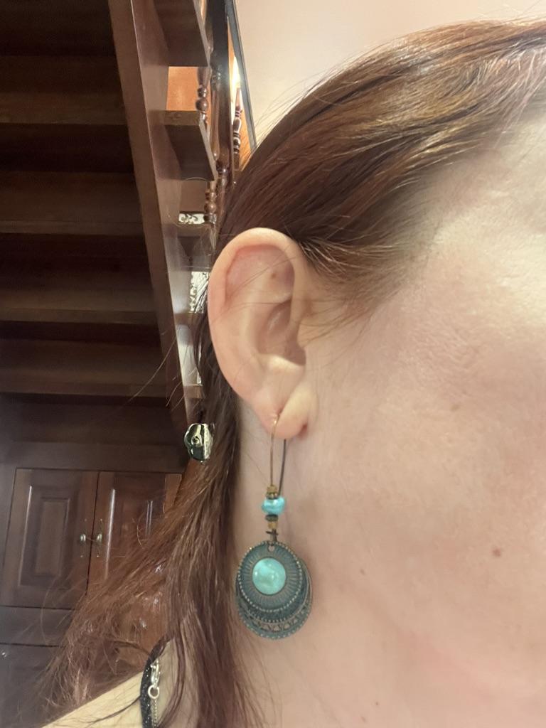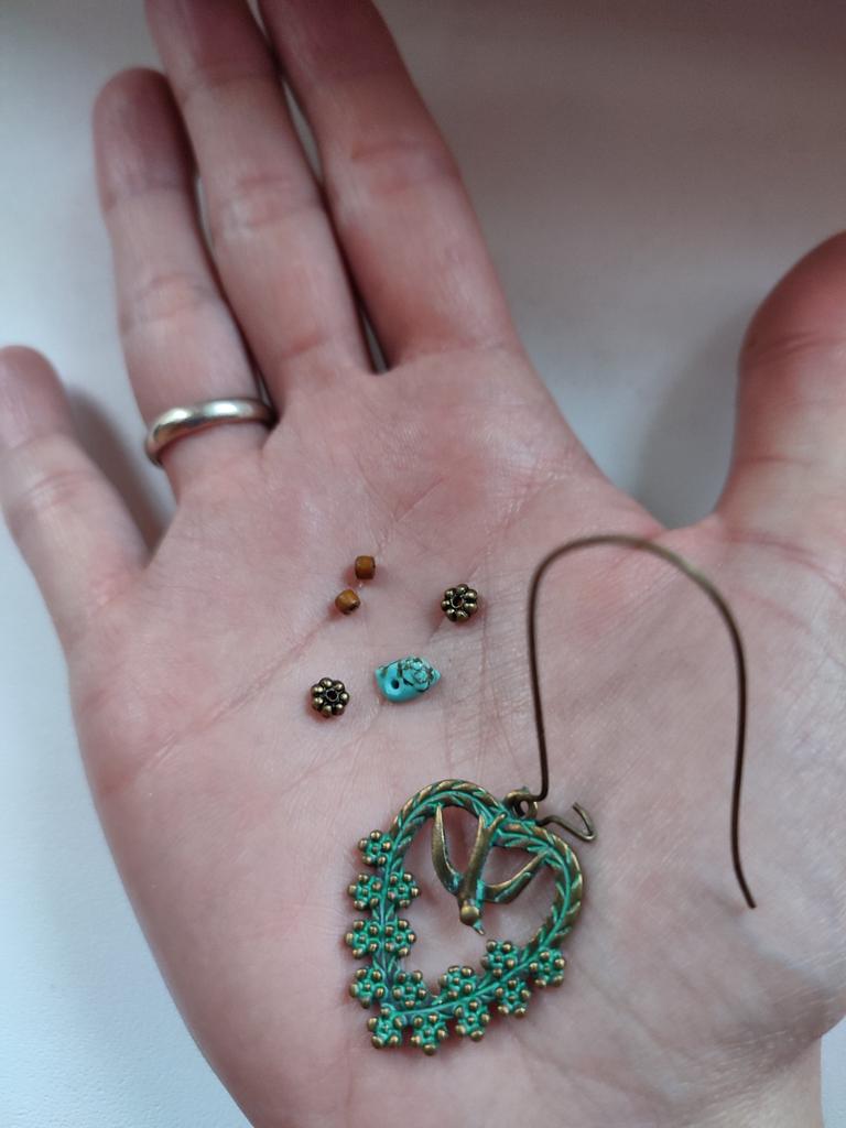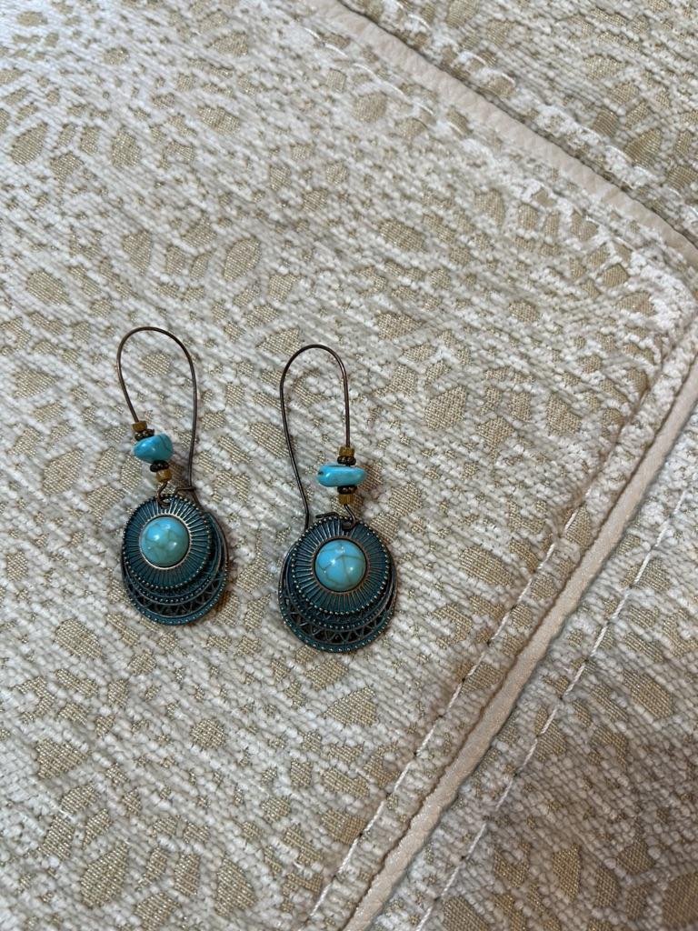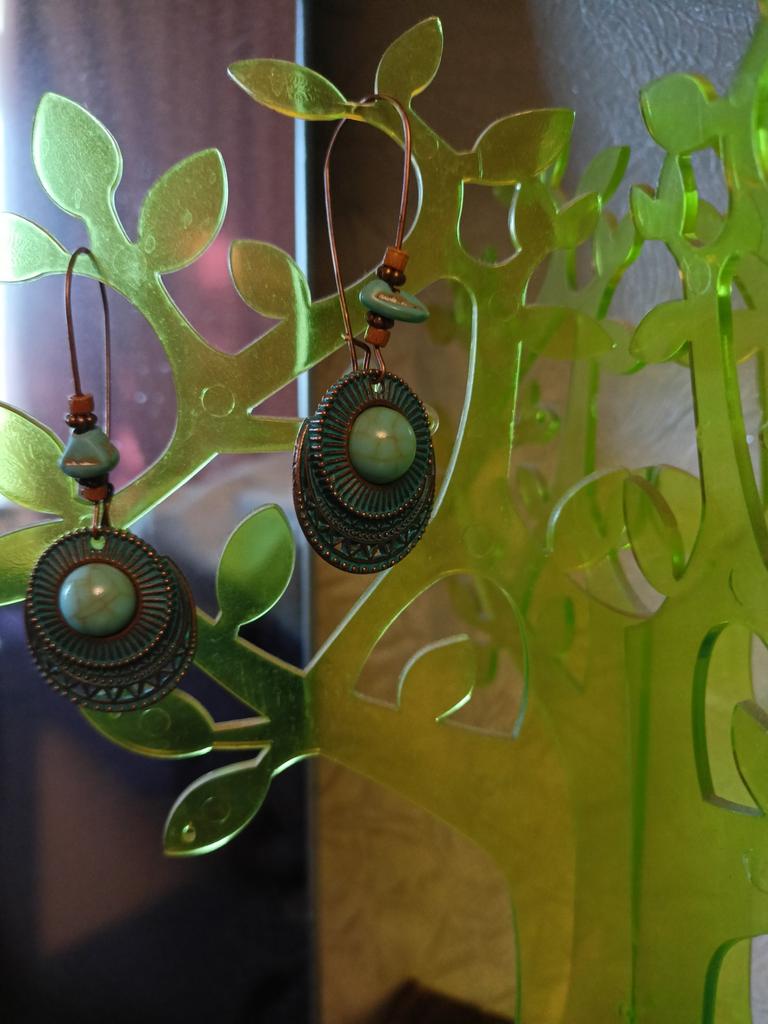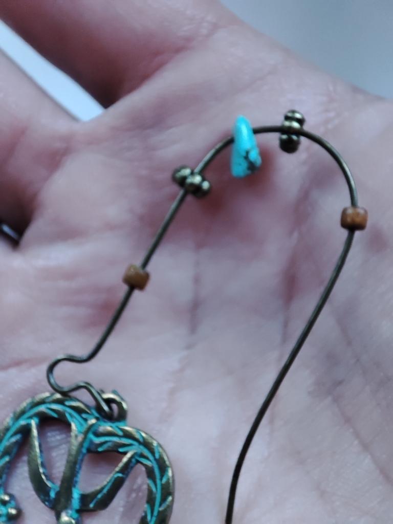 Made to look antique. I like them very much. The bead in the center is plastic. A natural stone is strung on the fastening.