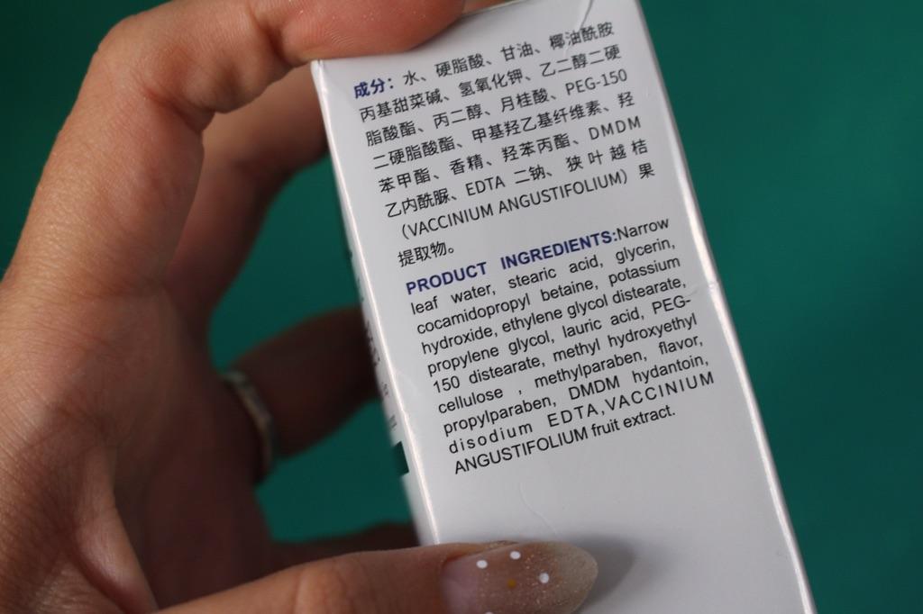 water, glycerin, stearic acid, palmitic acid, myristic acid, lauric acid, narrow leaf cranberry, hamamelis north america extract, hyaluronic acid sodium, potassium hydroxide, propylene glycol, hydroxymethyl, iodine propiolic alcohol, essence