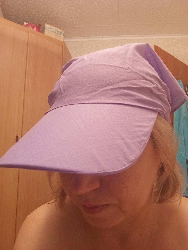 Everything is fine, just right for working in a confectionery shop. If you twist the scarf with a rope, you just get a visor with a ribbon, like a tennis player’s.