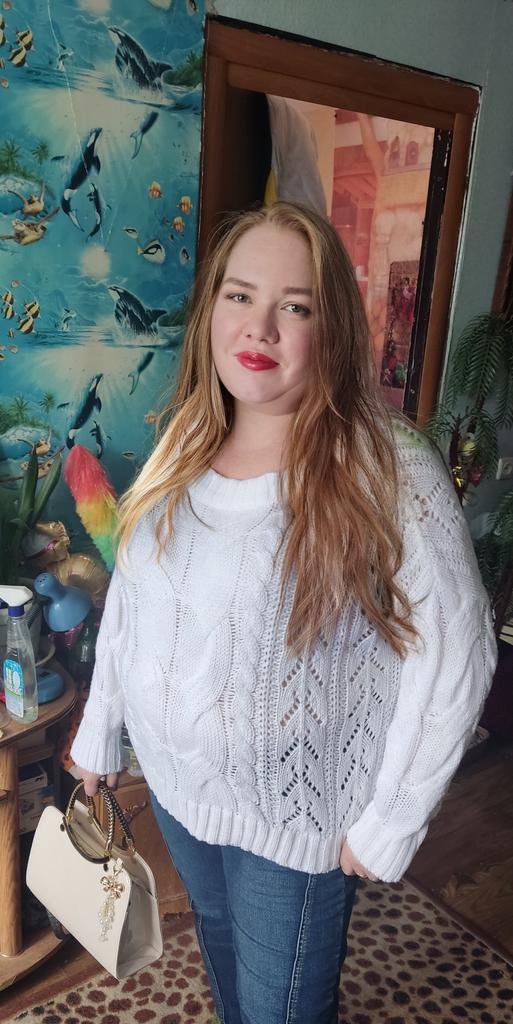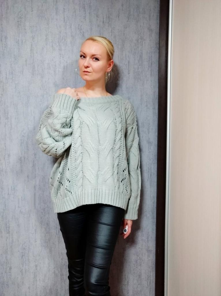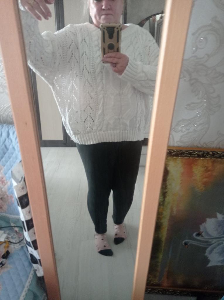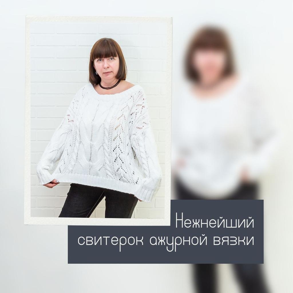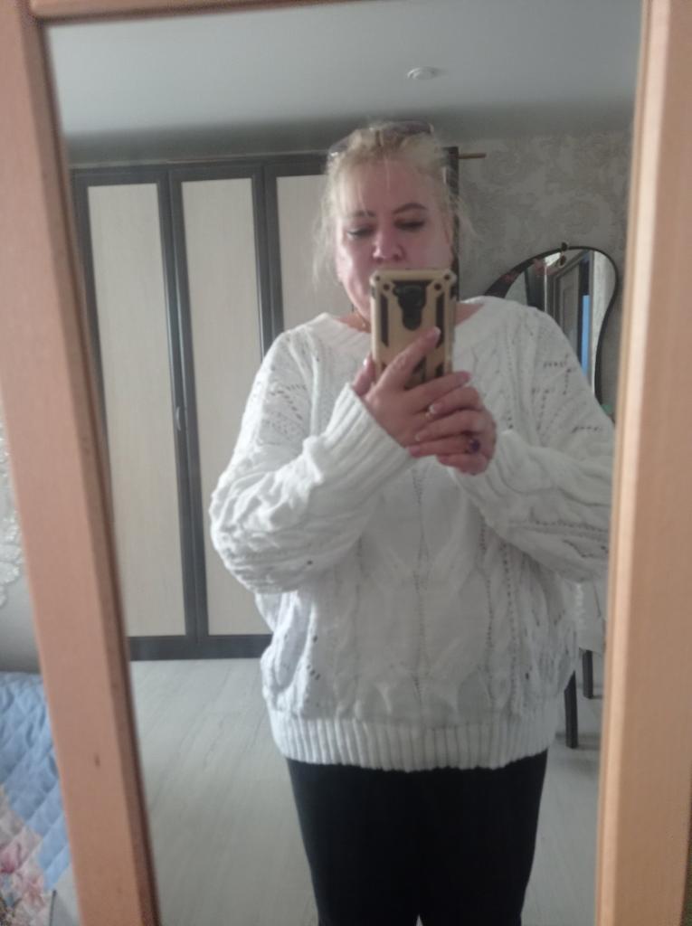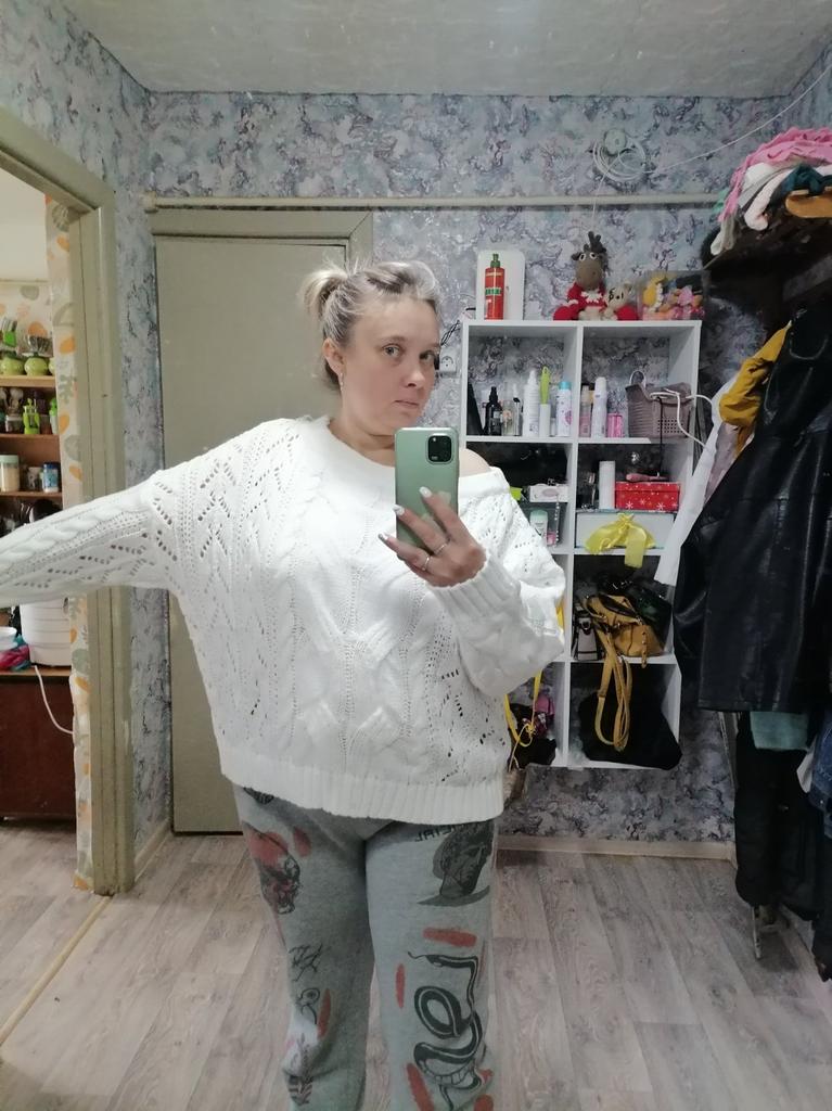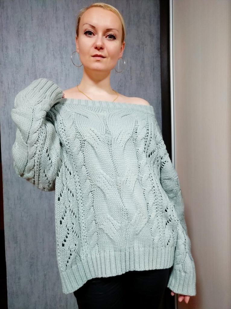 On the size 42-44 ugly large. The shoulders are very large, due to this the sleeve hangs, even if you turn it up, the sides hang a lot, well, very much ... and I don’t know how to fix it yet .... The sweater itself is soft, openwork, not thin.
