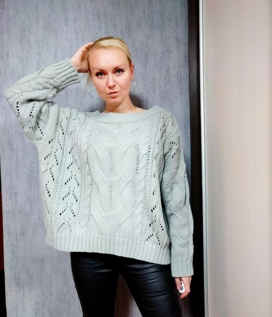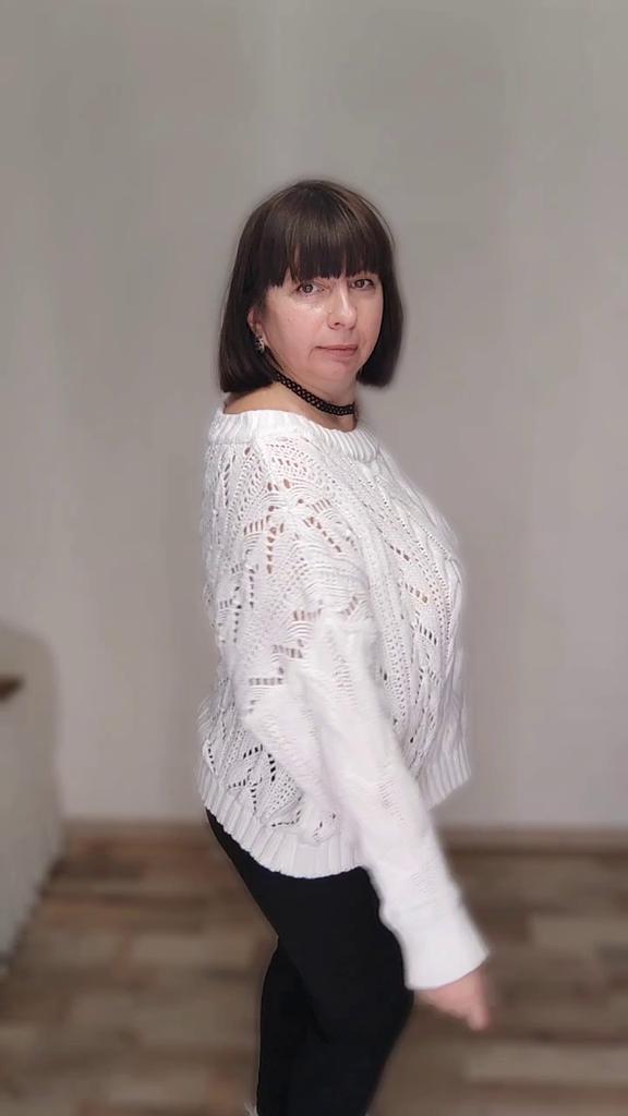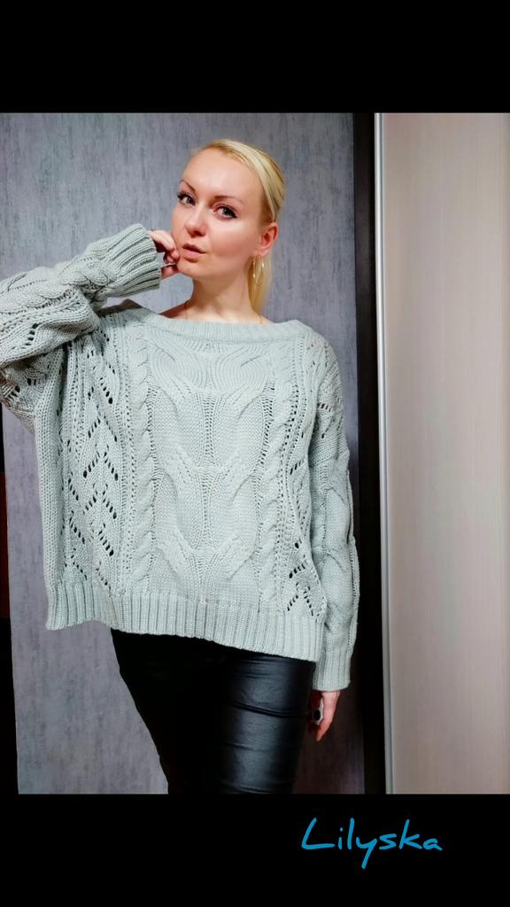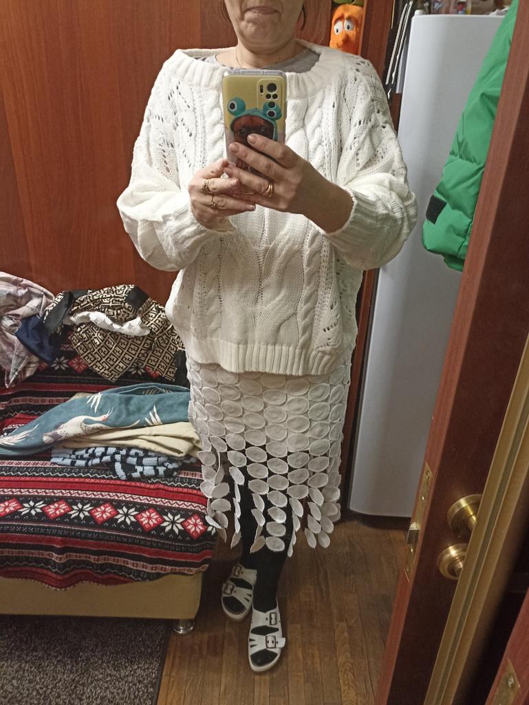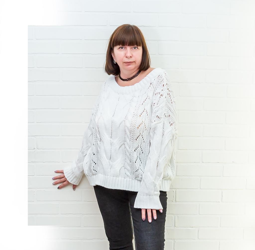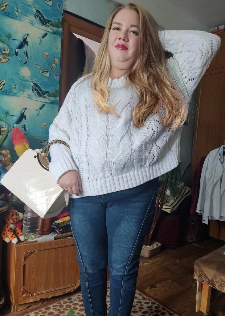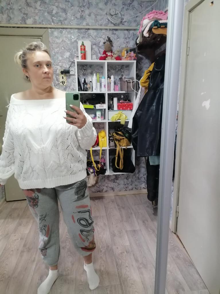 On the size 42-44 ugly large. The shoulders are very large, due to this the sleeve hangs, even if you turn it up, the sides hang a lot, well, very much ... and I don’t know how to fix it yet .... The sweater itself is soft, openwork, not thin.