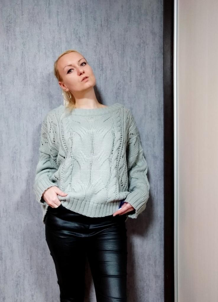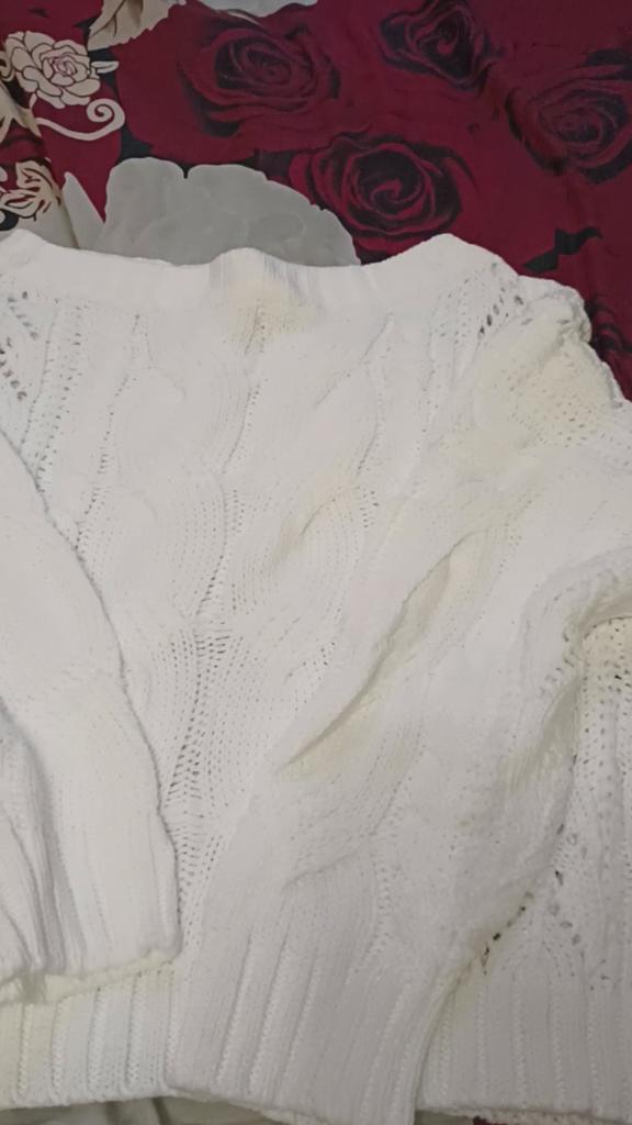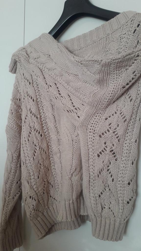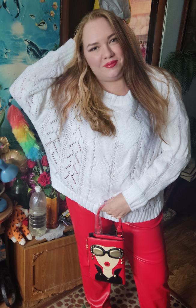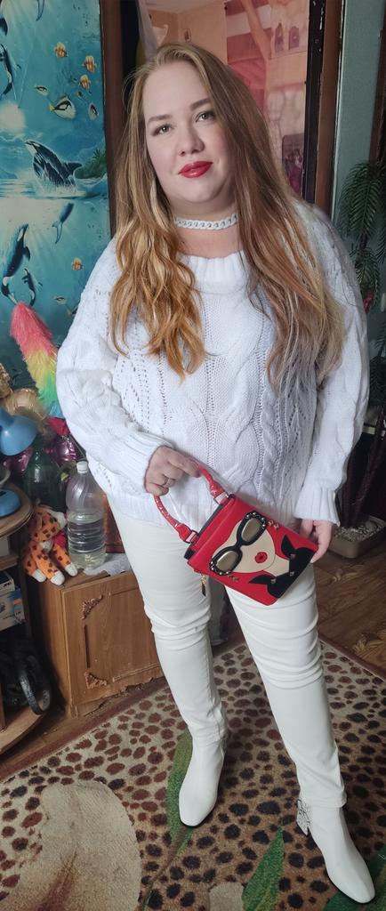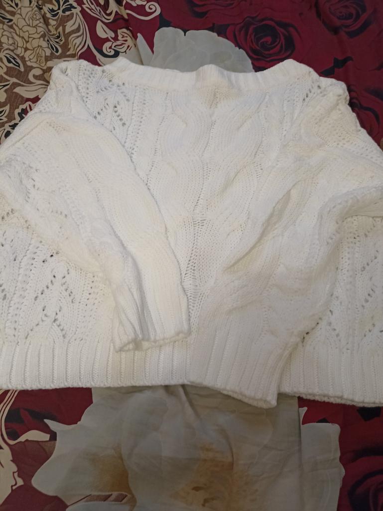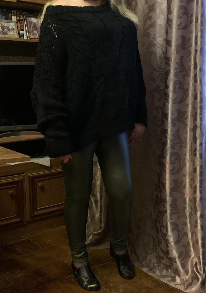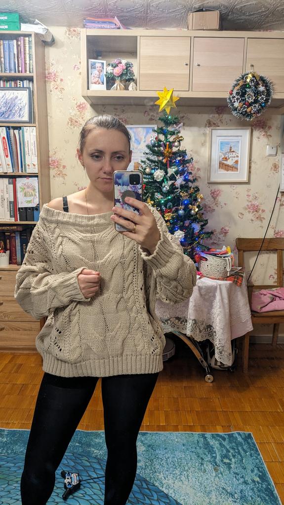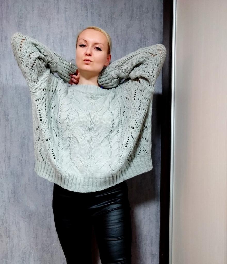 On the size 42-44 ugly large. The shoulders are very large, due to this the sleeve hangs, even if you turn it up, the sides hang a lot, well, very much ... and I don’t know how to fix it yet .... The sweater itself is soft, openwork, not thin.
