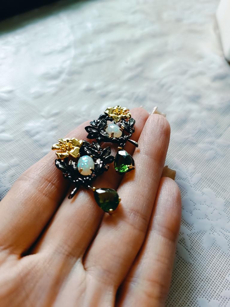 Elegant Ladies Plant Flower Pearl Green Zircon Drop Earrings Opal Earrings Ladies Jewelry Luxury Black Gold Ladies Earrings