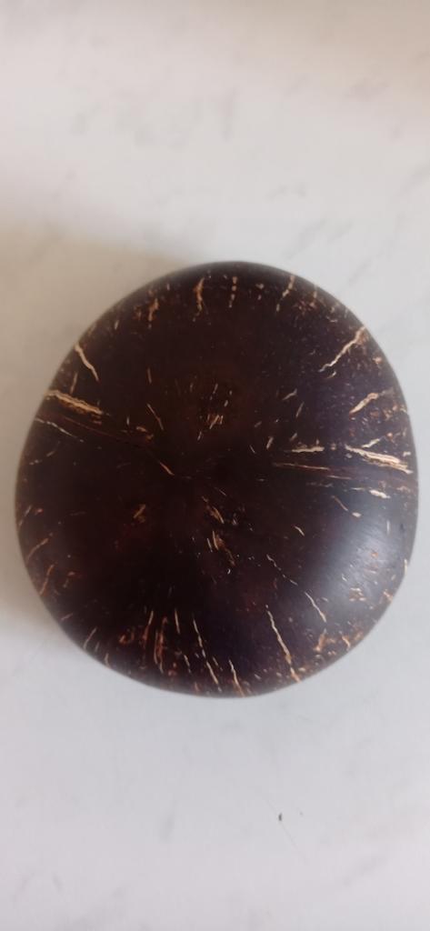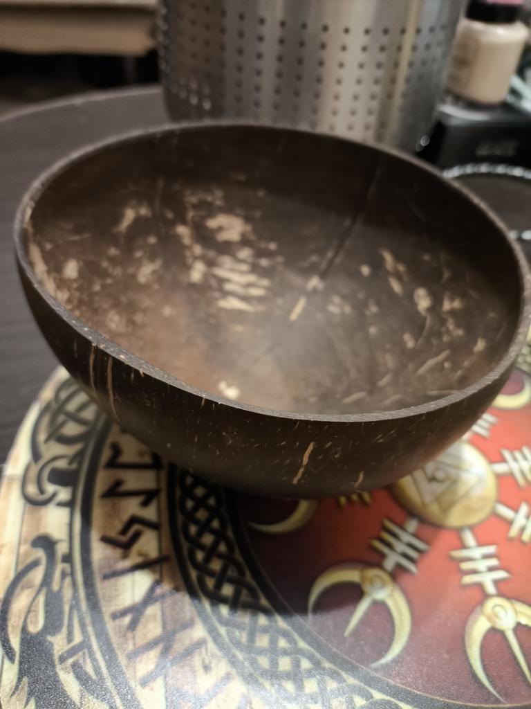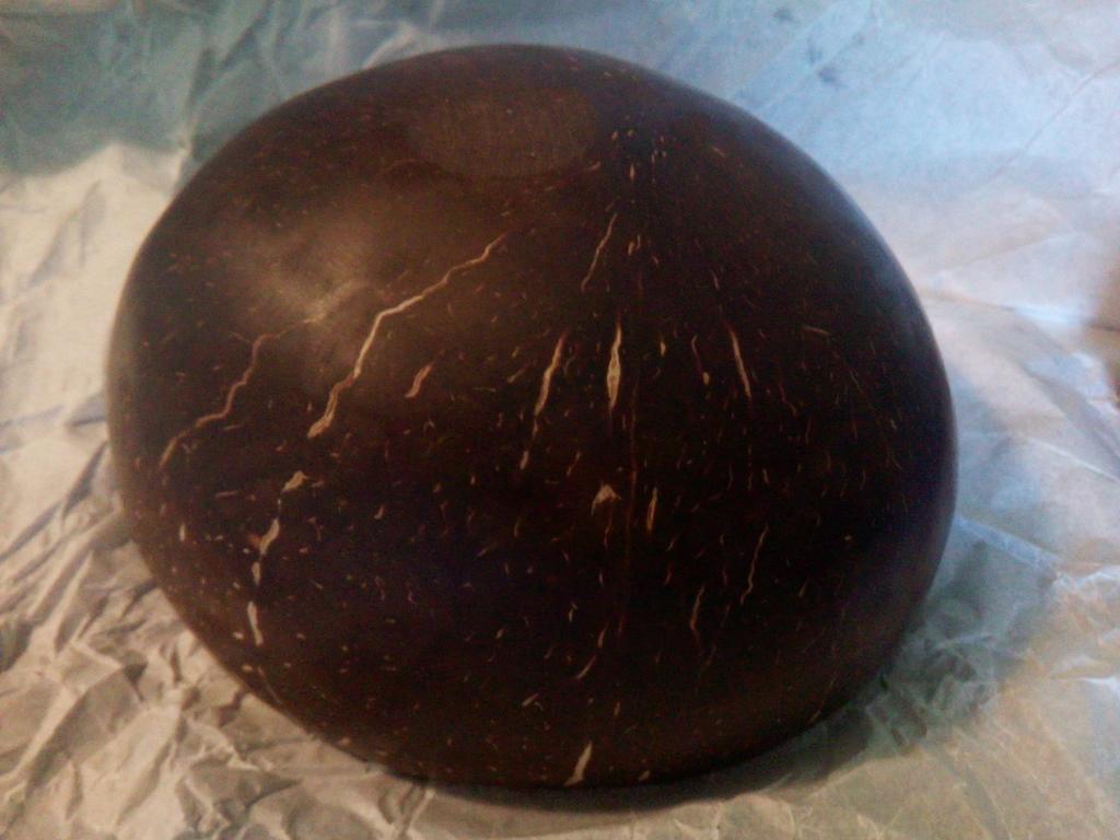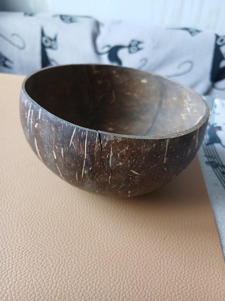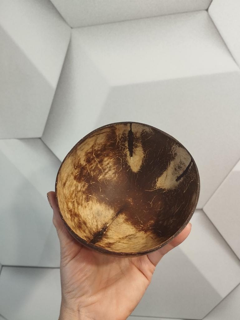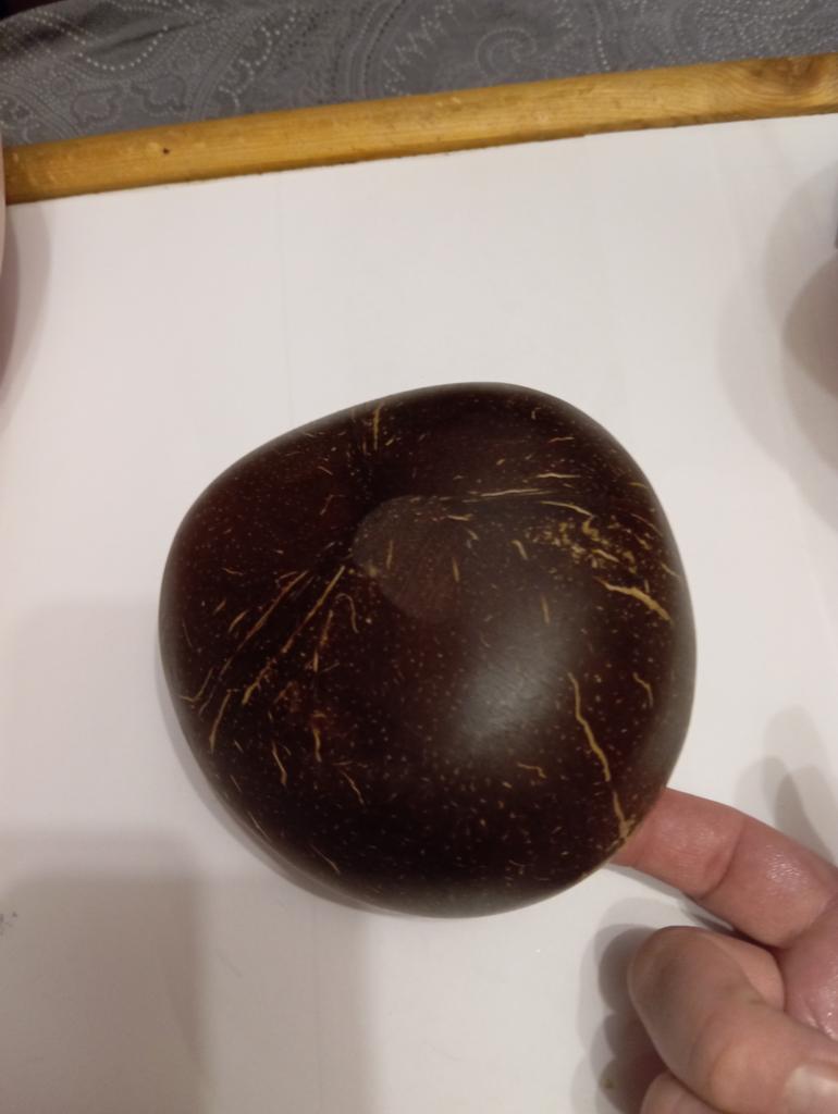 Very cute bowl made of natural coconut, but there is a drawback - a plastic or wooden ring is needed under the round bottom for stability, otherwise you will have to hold it in your hands all the time