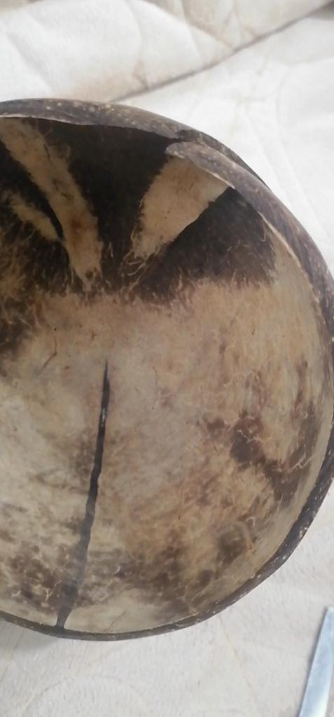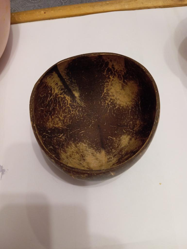 bowl is large, can be used as a salad bowl. Well polished. Natural coconut