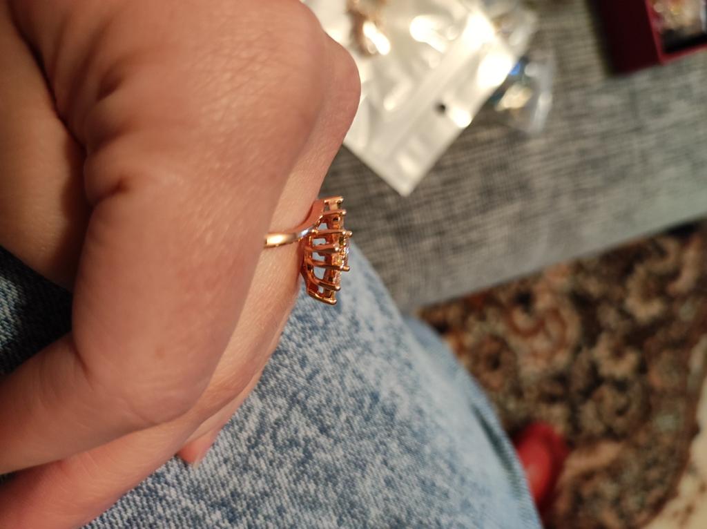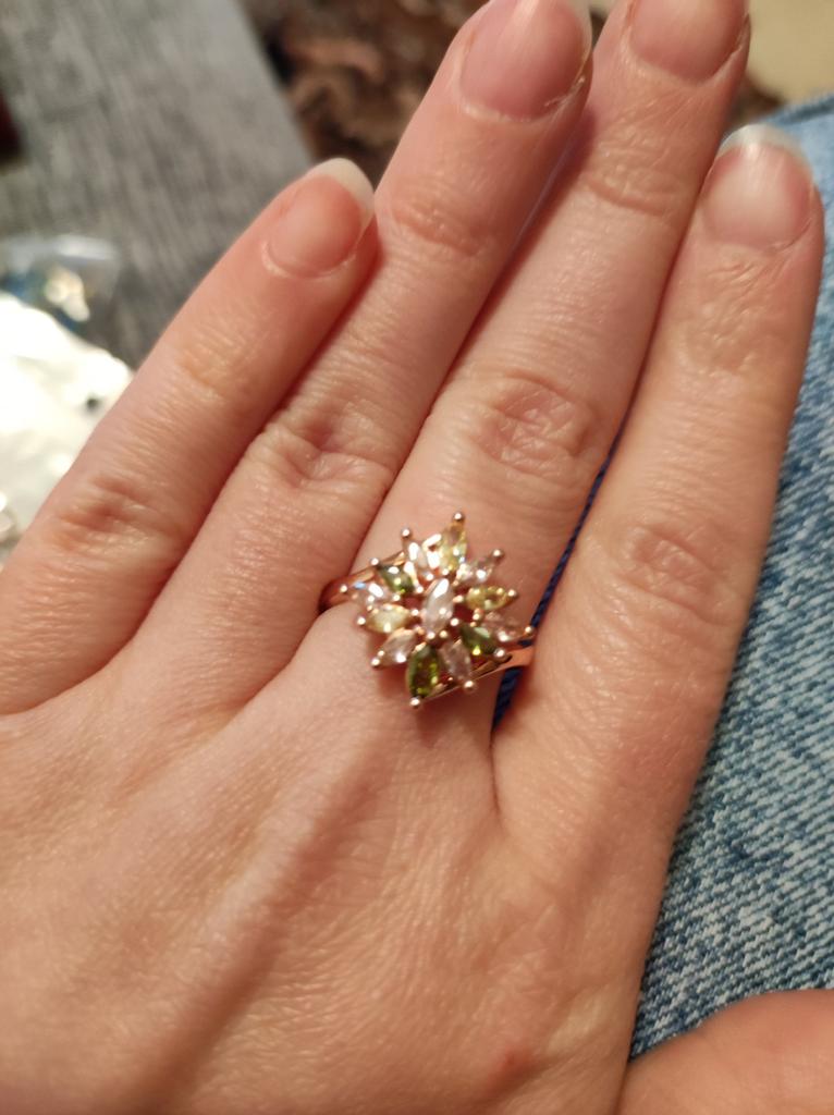 A very beautiful ring. The work is neat. The stones are soft but bright. It looks like a tourmaline ring. Even the pink gilding does not spoil it. Pleased.
