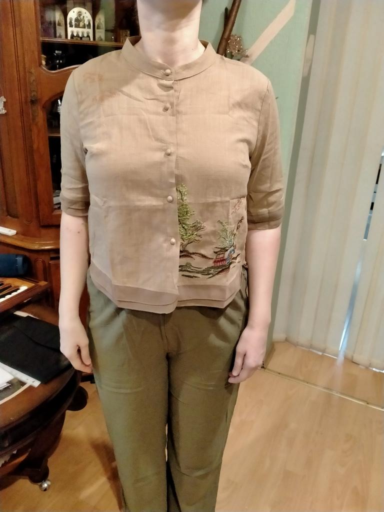 A good, high-quality blouse. But the length didn't suit me. Very short. On mine 174 to the waist. Everything is fine in the chest and shoulders, as for me. On small ones. It's a pity.