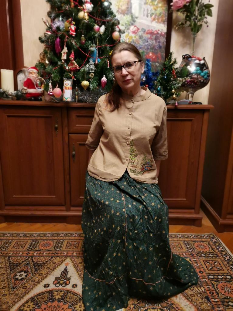 The blouse fit perfectly at 48-50. The quality is excellent, but the color is more beige than green. I will wear it with pleasure.