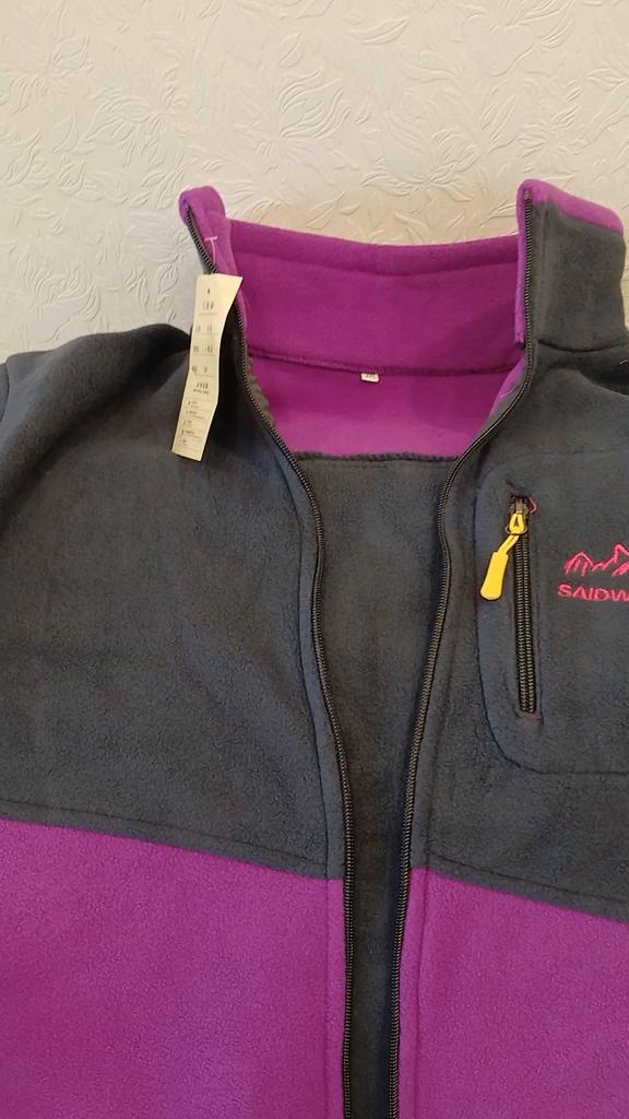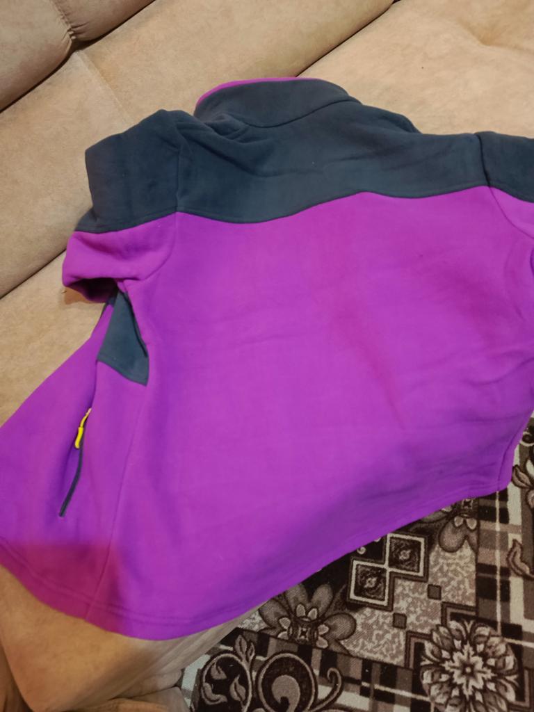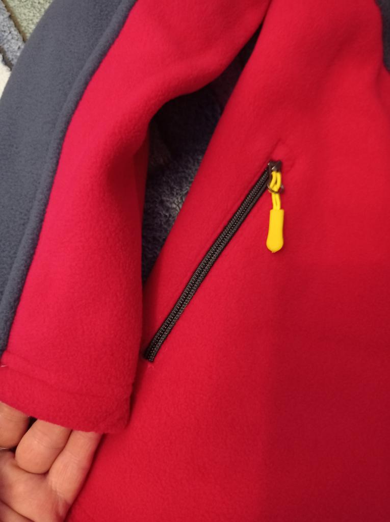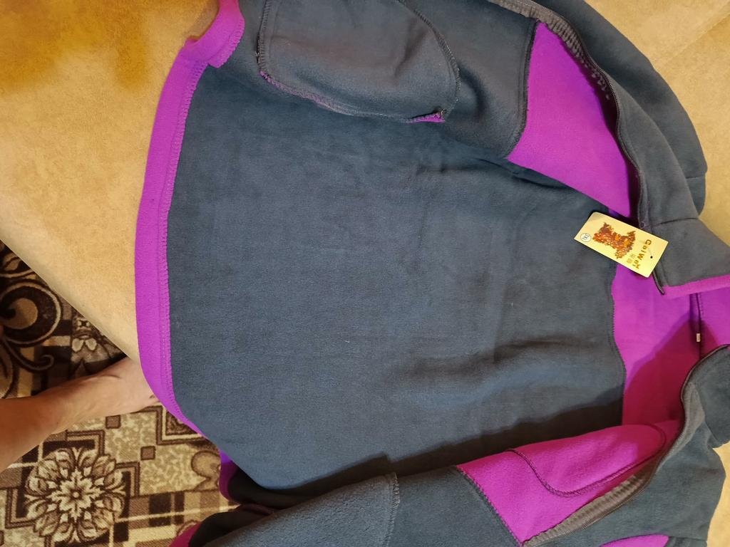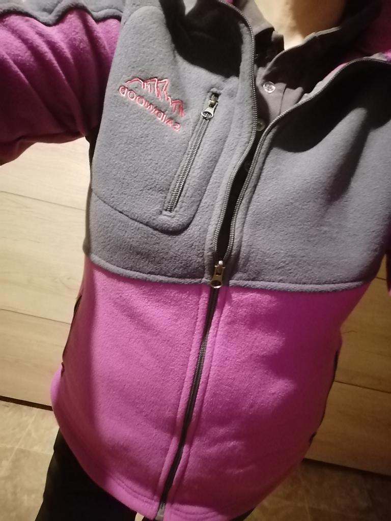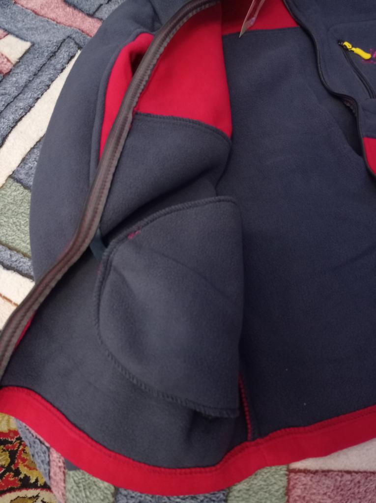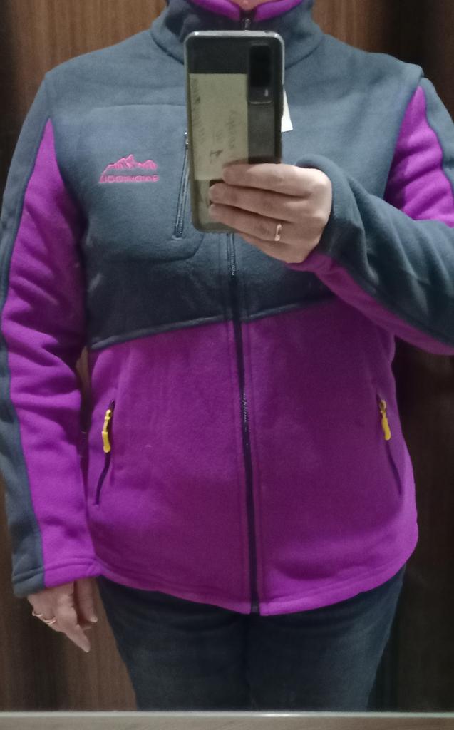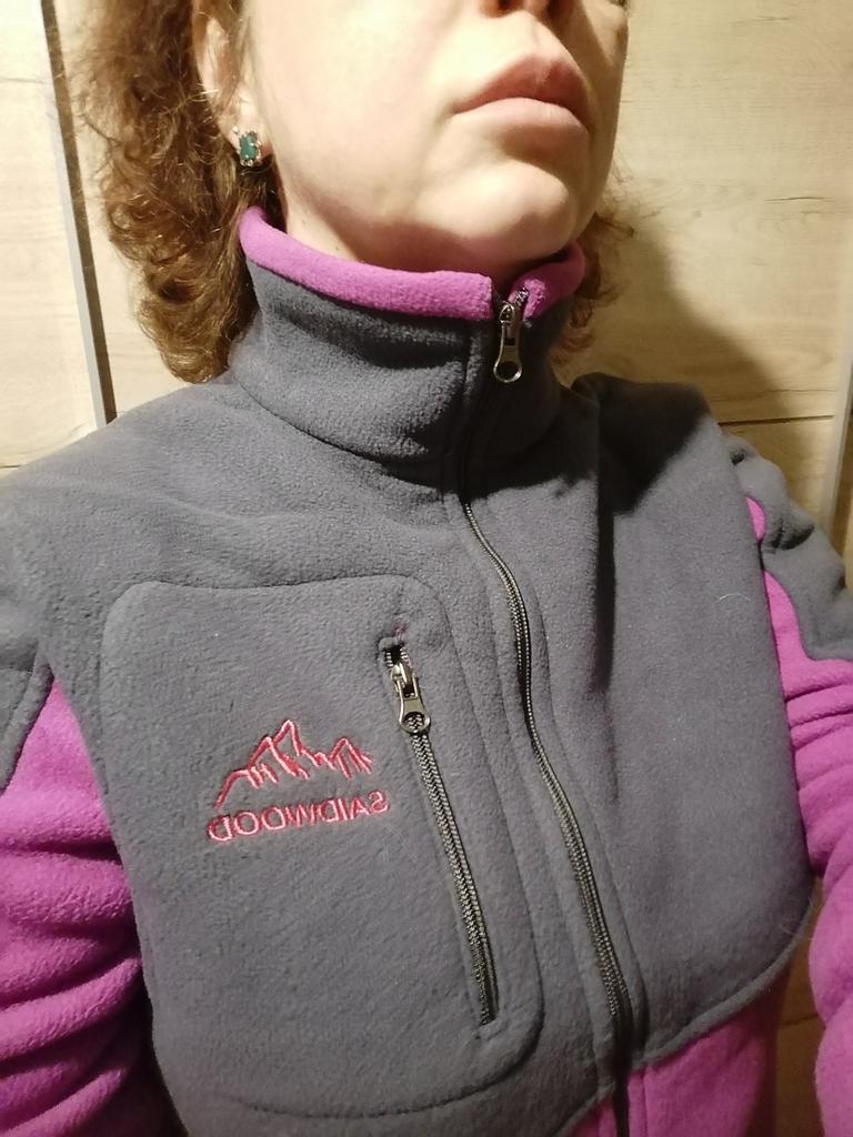 The fleece jacket is made of thick fleece. It is not sewn very neatly, though, there are a lot of protruding threads. It is too big in the shoulders and too small in the hips. There are also complaints about the locks: they get stuck.