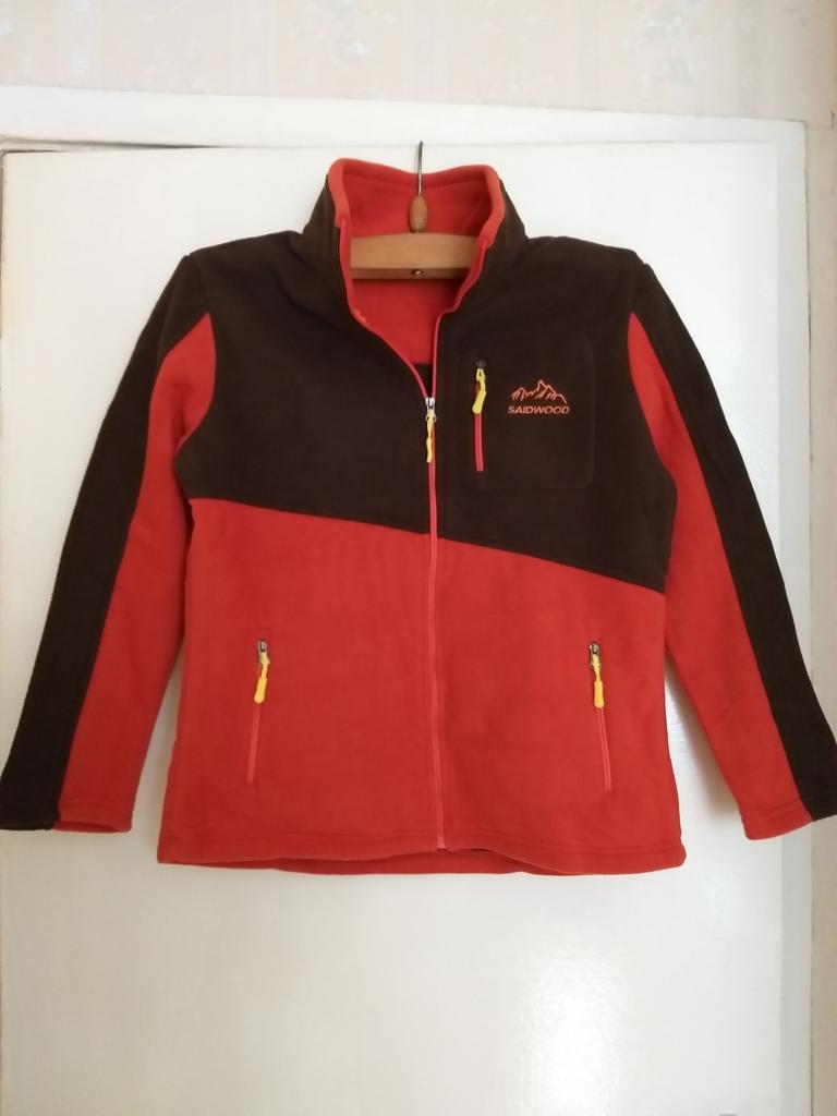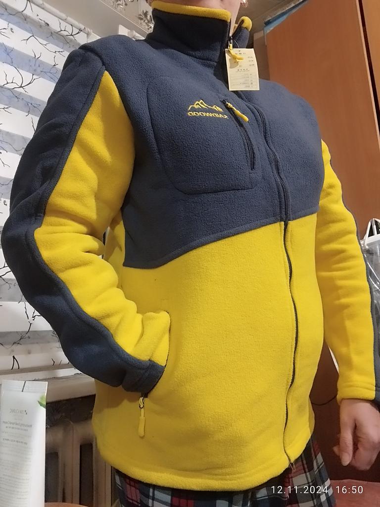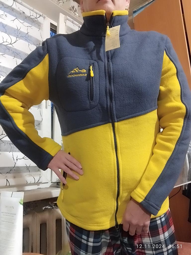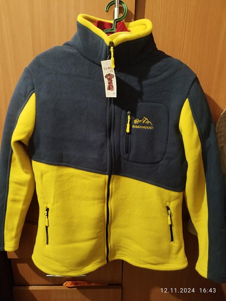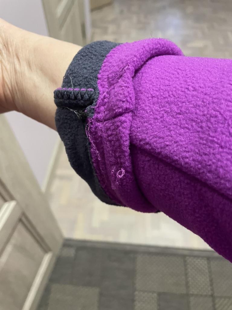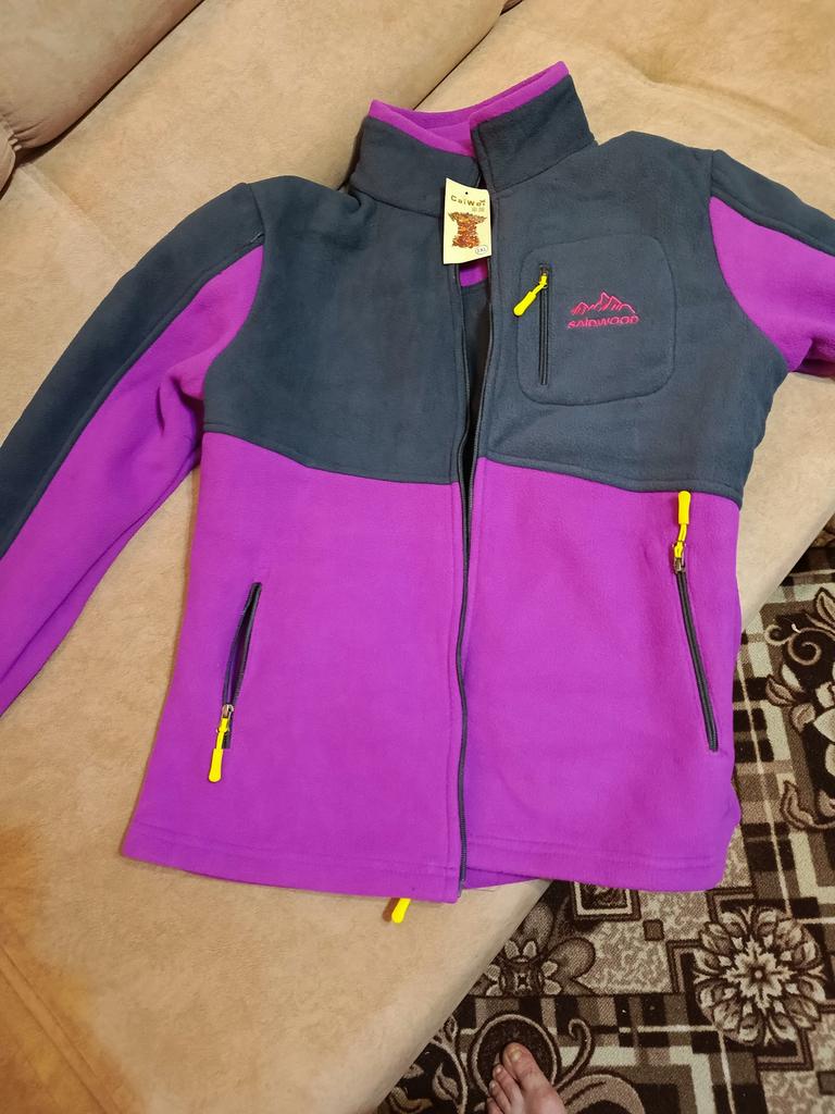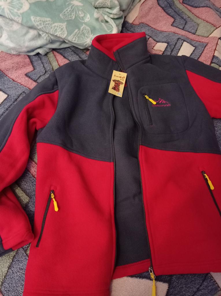 The fleece jacket is made of thick fleece. It is not sewn very neatly, though, there are a lot of protruding threads. It is too big in the shoulders and too small in the hips. There are also complaints about the locks: they get stuck.