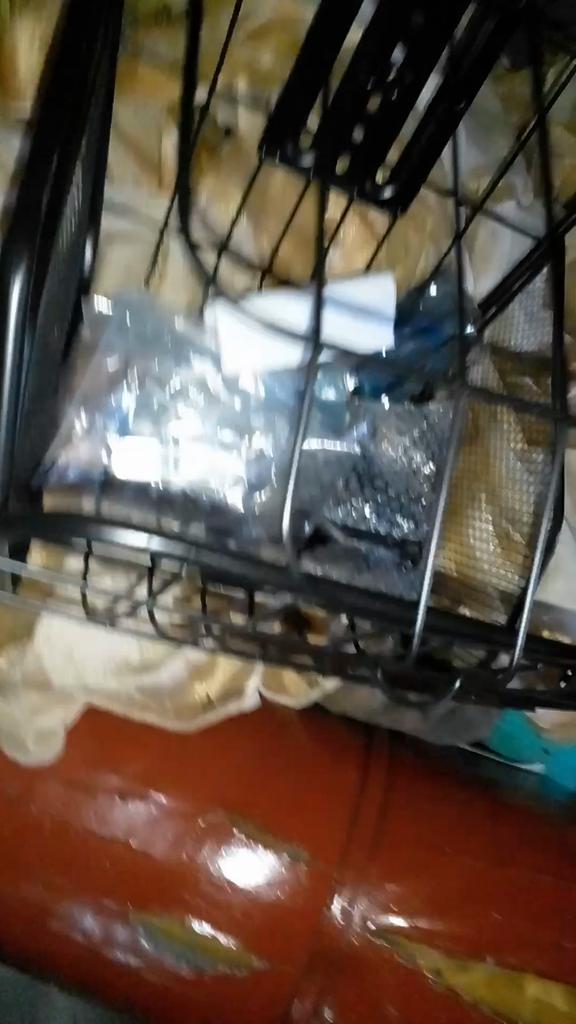 The lid is not attached. The basket is empty. The edge of the basket was bent (probably during delivery)