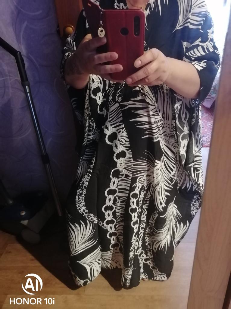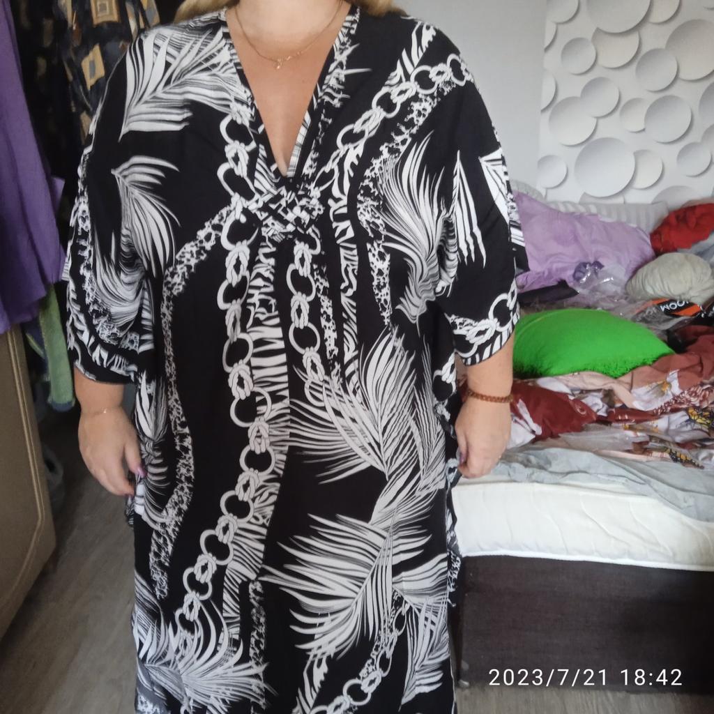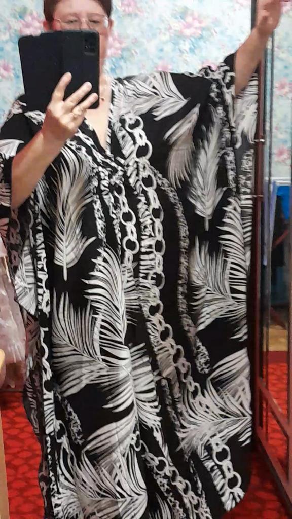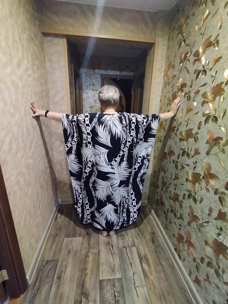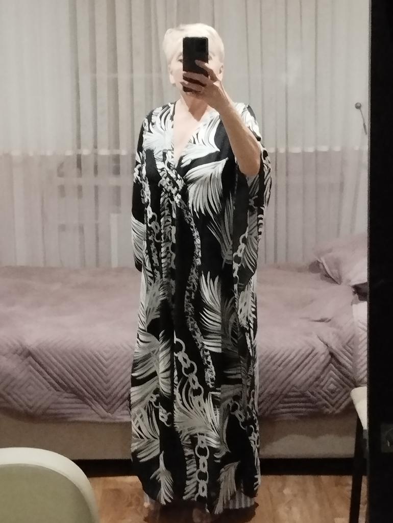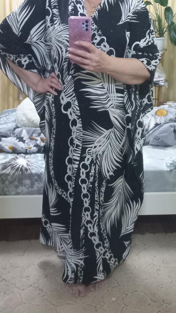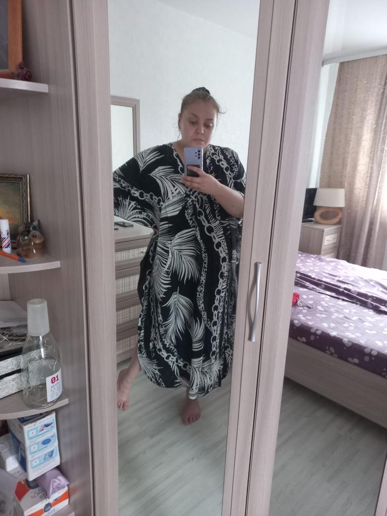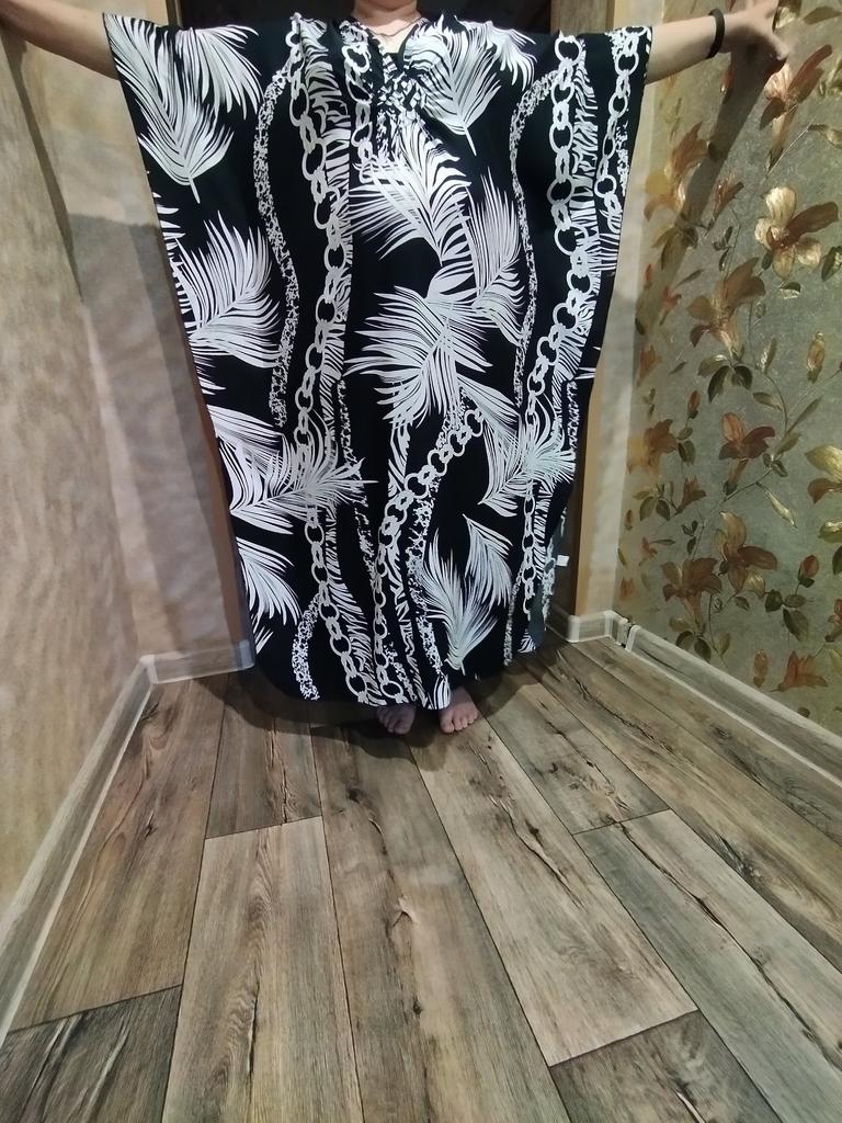 The dress is super. For tall ladies. Wide, so it is suitable for women of different builds. Very good for relaxing. Cotton fabric. I recommend!
