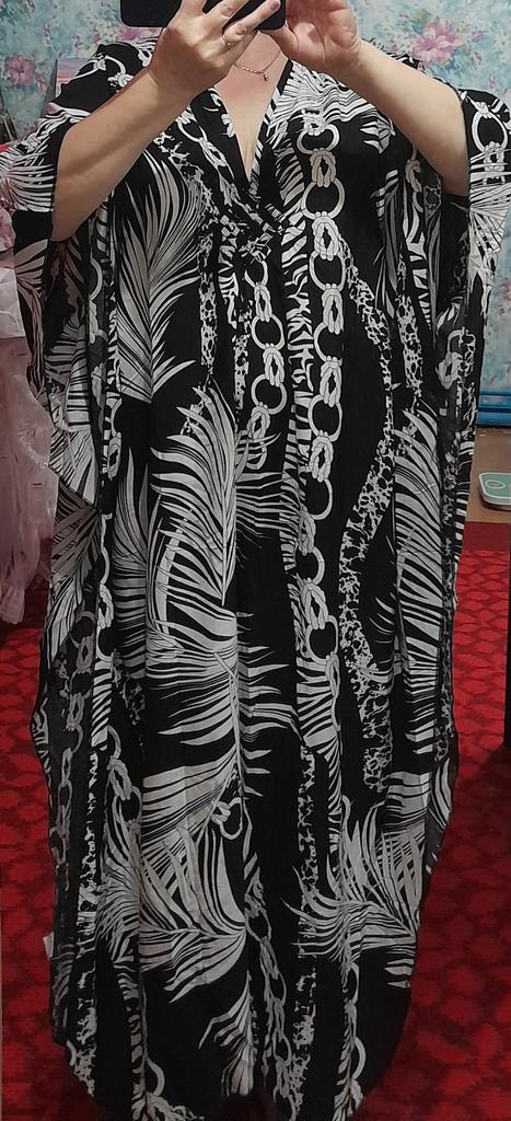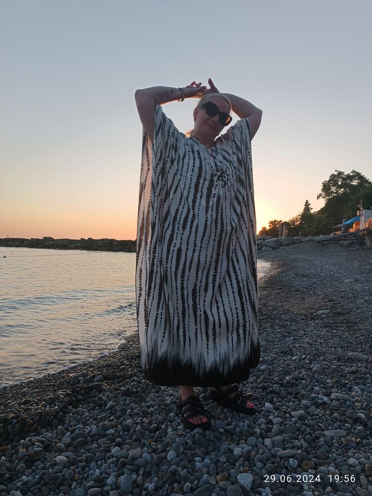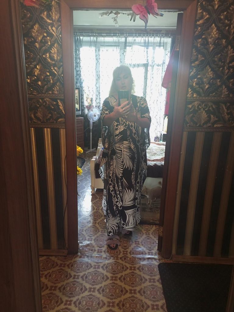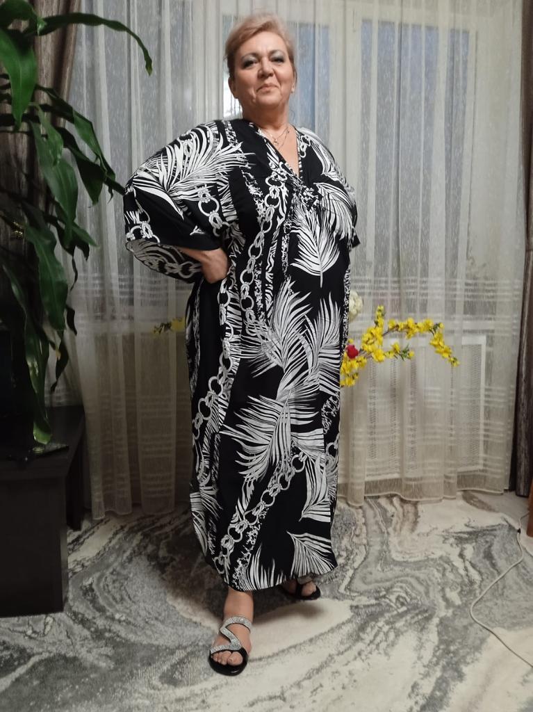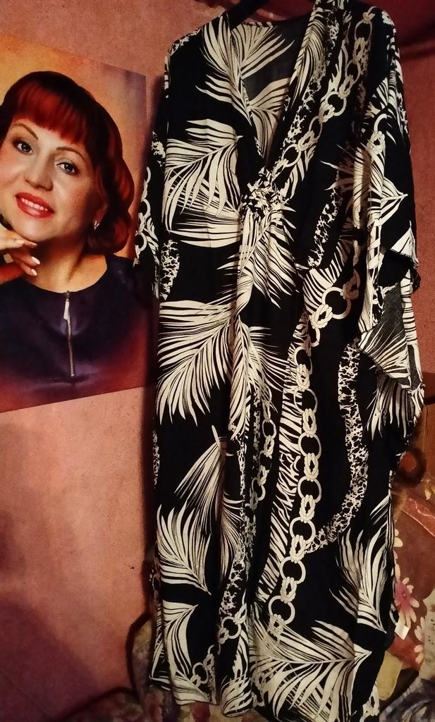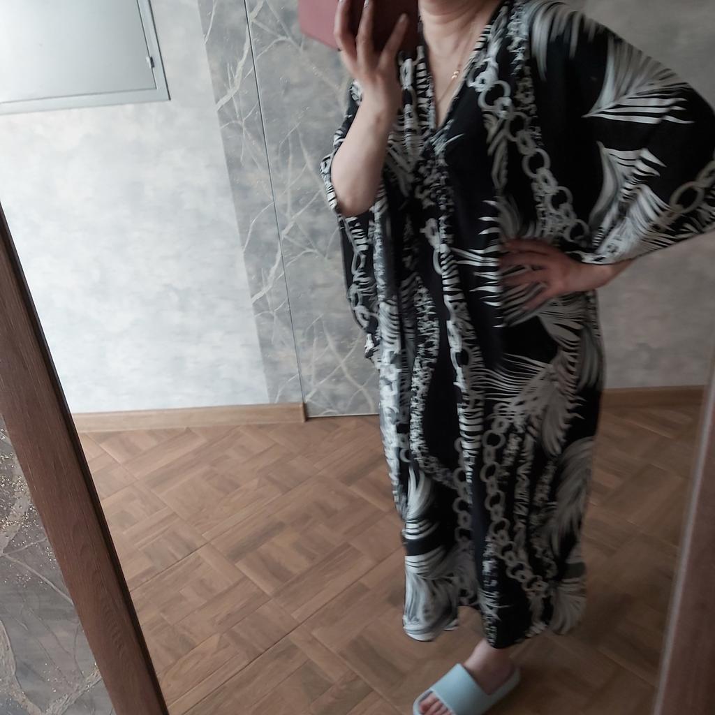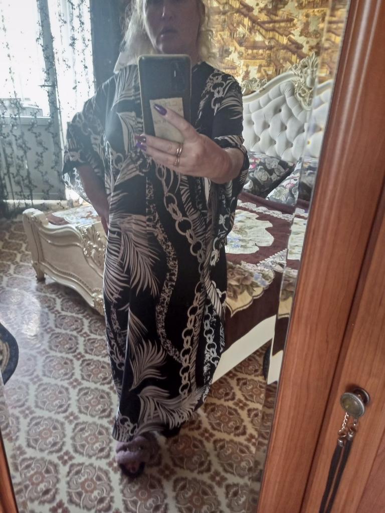 The dress is super. For tall ladies. Wide, so it is suitable for women of different builds. Very good for relaxing. Cotton fabric. I recommend!