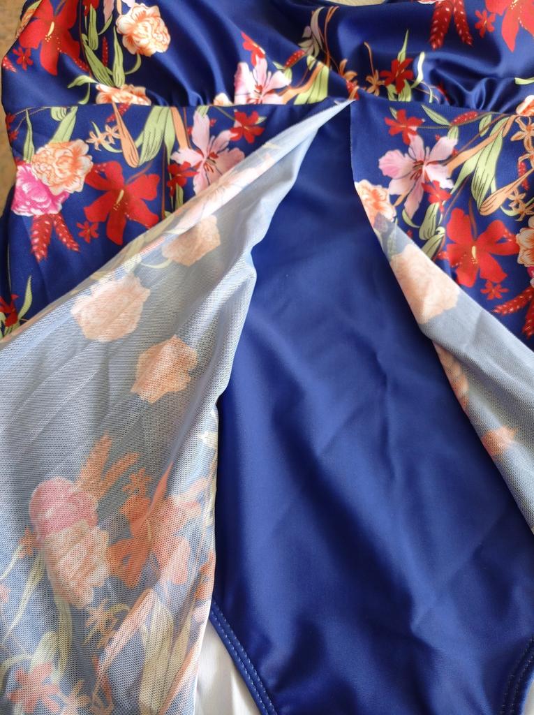 The swimsuit is of good quality. Well finished seams. The panties are quite wide at the back, they sit nicely (for those who don't like bikinis or tights). The "cape" is not chiffon, but it is high-quality and pleasant to the touch, the length is also suitable: neither long nor short. Disadvantages: for a height of 172 cm, the swimsuit is short in length, the curve in the back does not fit in the back, and the front pulls the chest down. It will look better for shorter height. The size grid corresponds to reality, the 0XL size fits perfectly in all volumes. In addition, who has a large bust, it is still better to buy swimsuits with separately sewn cups, and not as on this swimsuit, to support the bust.