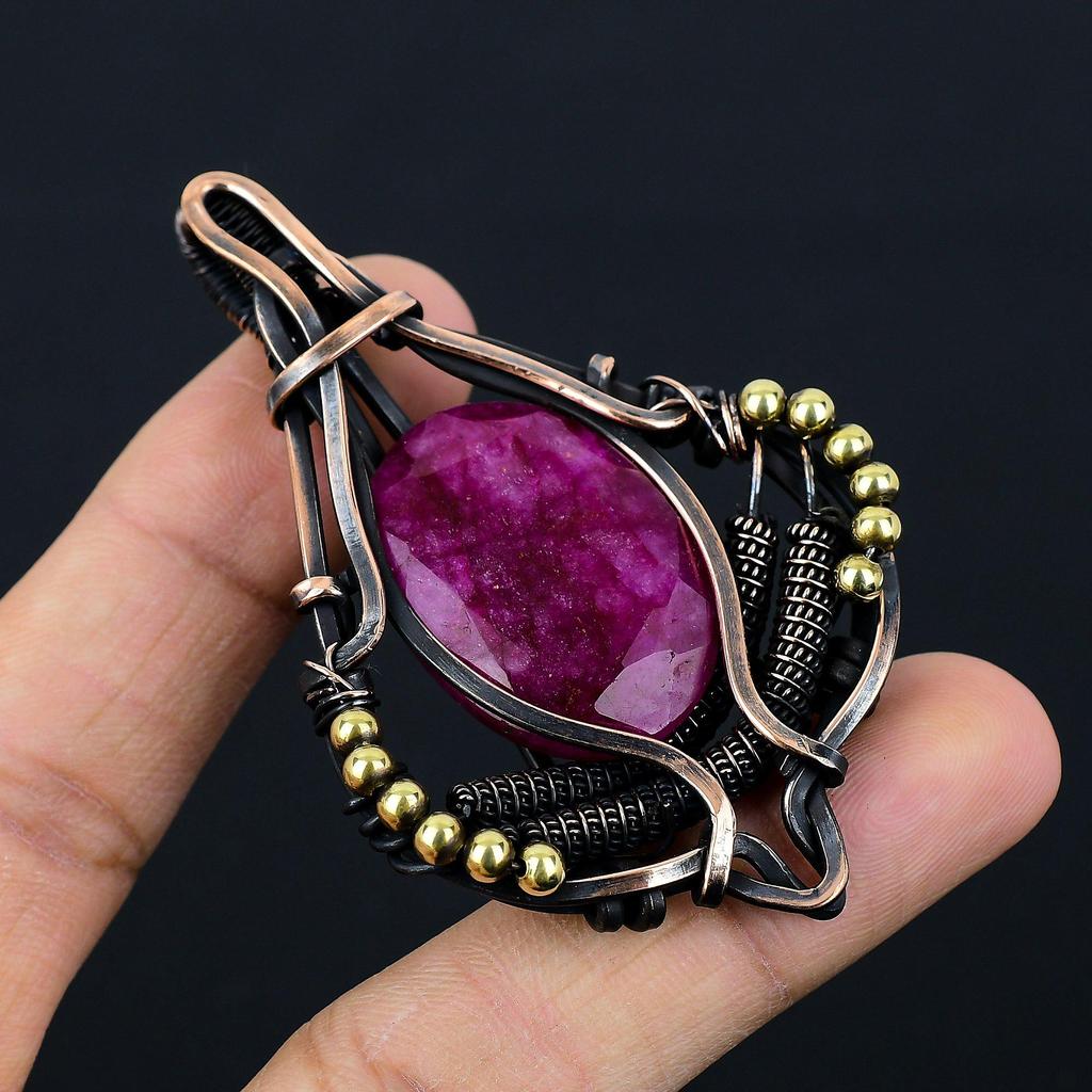 Lab-Created Ruby Gemstone Pure Copper Wire Wrapped Designer Handmade Pendant Jewelry Gift For Woman