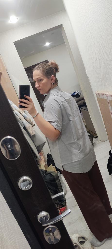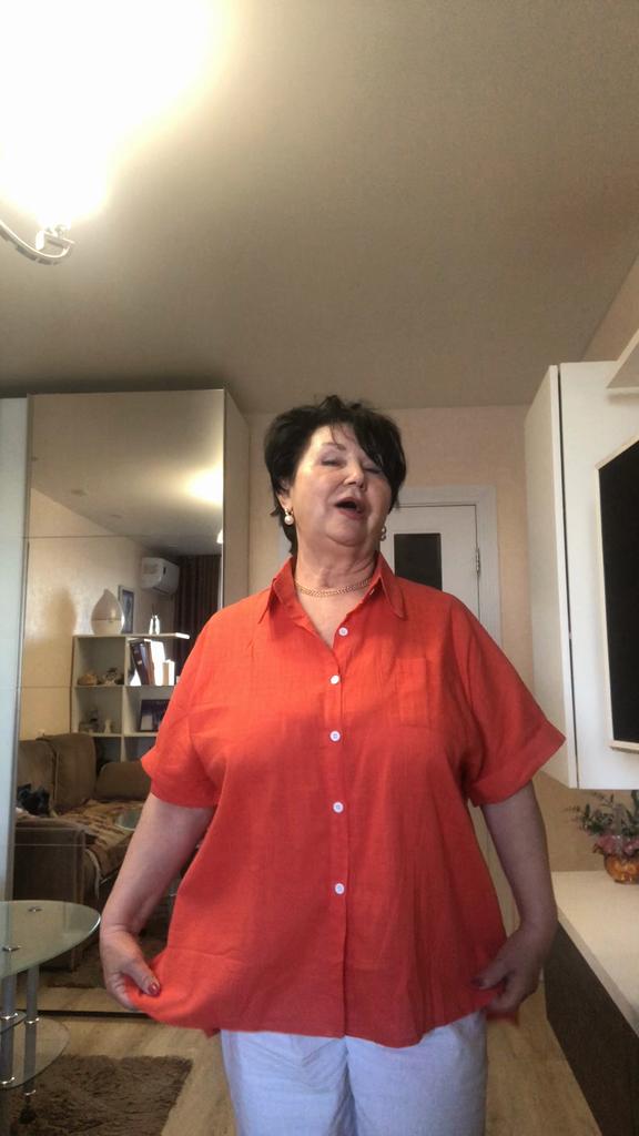 The blouse is big for size 52-54. It was quite possible to order XL. I ordered gray. The color of the blouse does not correspond to the rich color in the photo. In reality, it is pale gray, like a dirty white blouse. In general, there is something strange with the color.