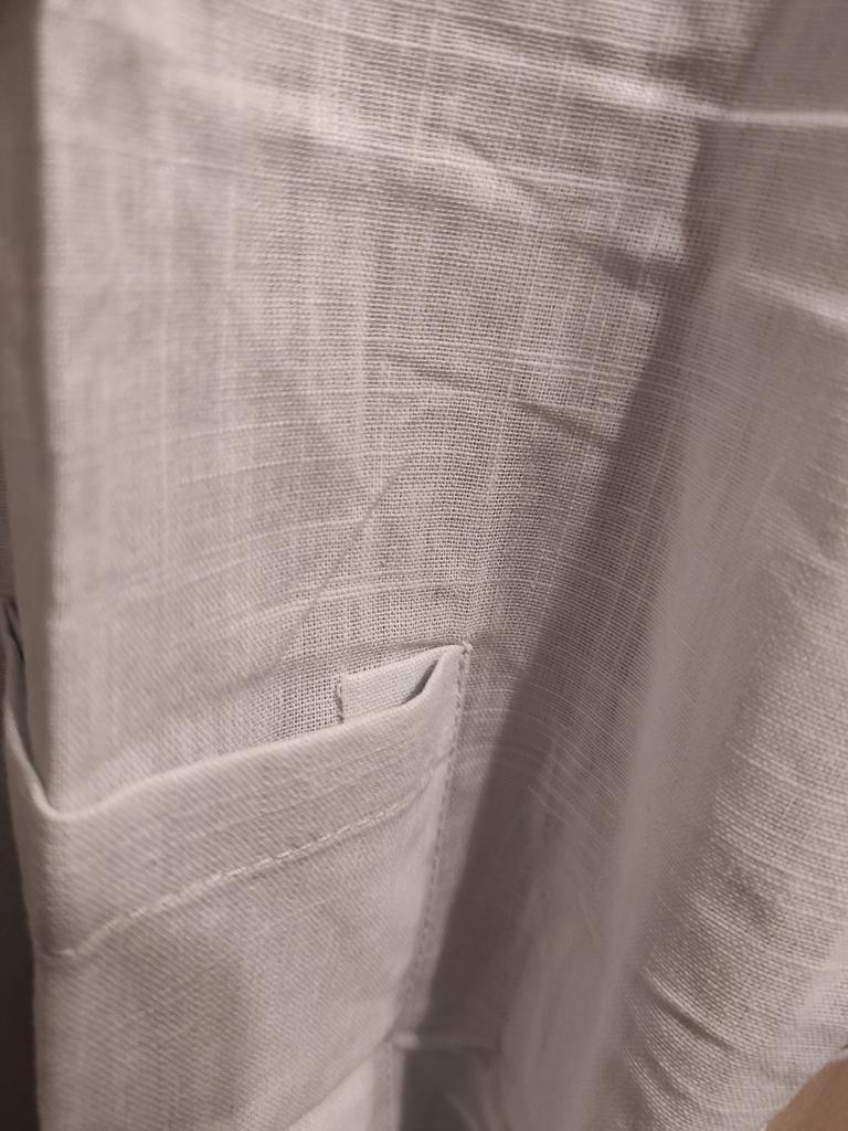 The stitching is good, the threads do not stick out, the buttons need to be changed. I suspect that it might shrink after washing, but that’s what I was counting on when purchasing.