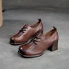 Johnature Retro Women Shoes Med Heels Solid Color Pumps Genuine Leather Round Toe Handmade Lace-up Shoes