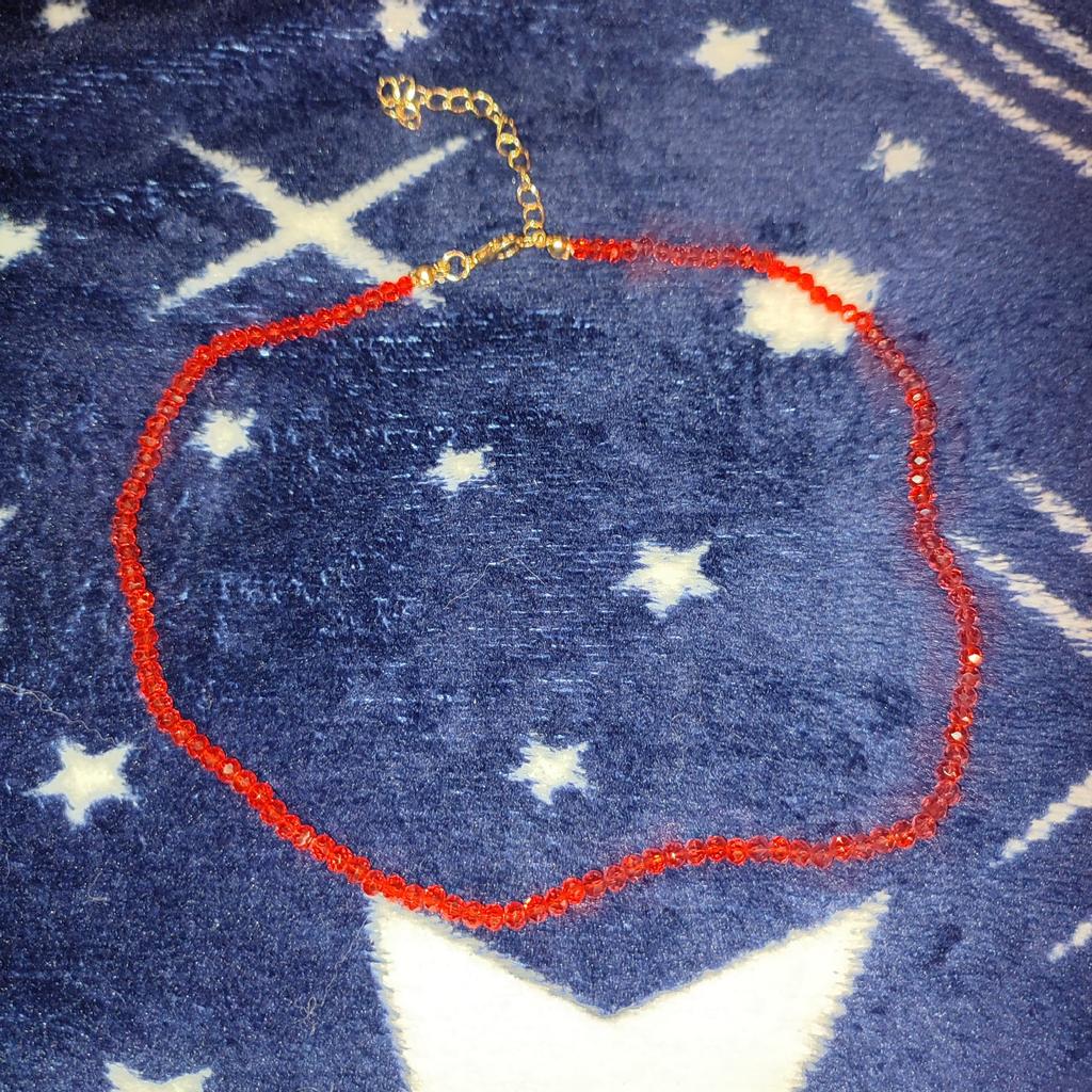 The red choker made of beads will fit on any neck as there is an additional chain, it looks beautiful, I recommend it