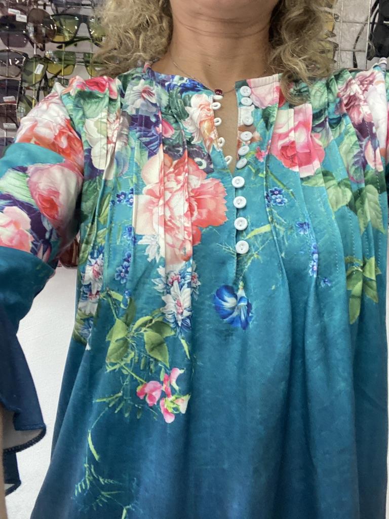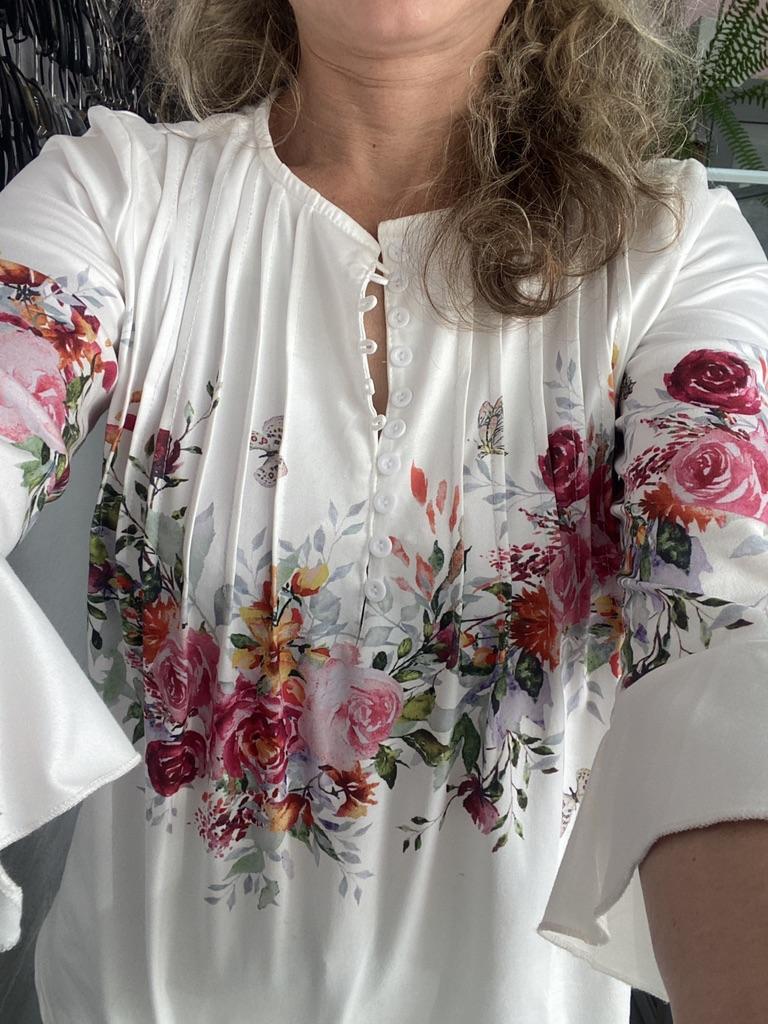Spring Summer Women's Flower Print V-Neck Short Sleeve Pleated Button T-shirt