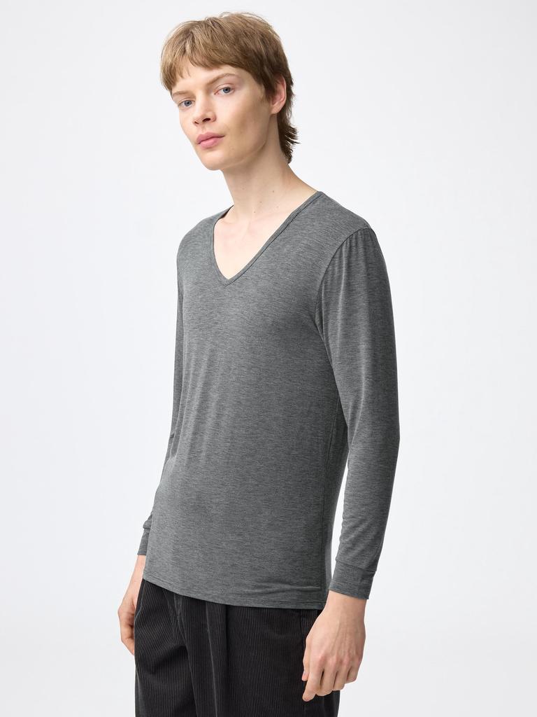 The GU Style Heated V-Neck T-shirt (9-minute sleeve) offers a classic yet stylish look and is available in various color options. Its eco-friendly aspect is emphasized with the inclusion of recycled polyester in the fabric.