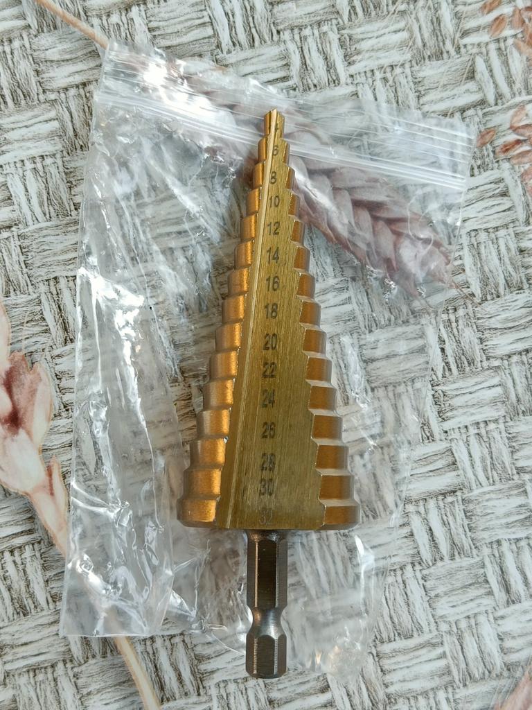 Step drill Also called "carrot" is intended for drilling holes of different diameters in sheet and thin-walled products made of steel, non-ferrous metals, stainless steel and plastic. Drill bit made of titanium coated metal 🧐Each next size has a smooth transition in the form of a step, which allows you to get a neat hole of the desired diameter👌 ✔️ Makes holes with even edges🕳️ ✔️ With one step drill you can make holes of various diameters ✔️ With large volumes of work, it saves time due to the absence of the need for private replacement of drills of various diameters👍