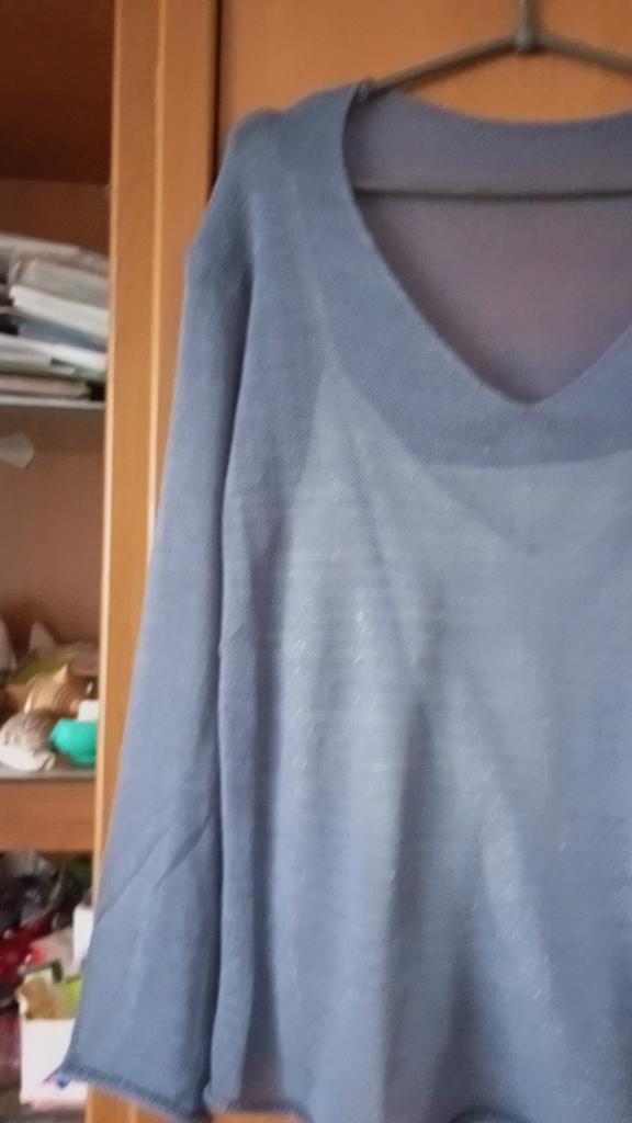 The blouse fits well for a size 52-54, naturally there are some imperfections in the fabric, and dropped loops and skewing at the sleeves. It is translucent. The length is normal, after washing it did not fade or lose its shape.