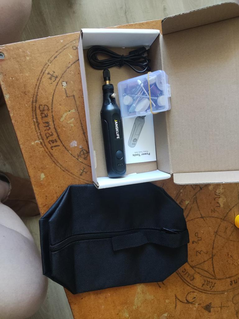 A good low-power device for cutting, milling, drilling and grinding operations when processing small volumes of materials at home. I believe that it may well be useful for manicure and pedicure processing in the corresponding salons. Discharged - put on charge, inserting a micro USB cord into the body from the end side. Red lights blink - charging. Green lights up - charged, can be disconnected. Turns on by pressing: three rotation speeds - minimum, medium, maximum and off. A set of collet clamps allows you to clamp tools of various diameters in the chuck. Tools and small inventory are in a transparent plastic case. Everything is stored in a cover. Somehow convenient for transportation. Quite a successful purchase.