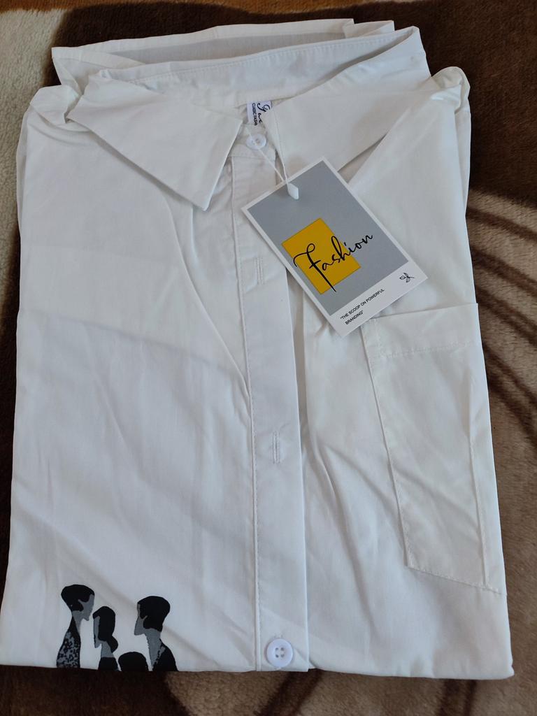The shirt is thick, loose, only there is an applique, a sticker and it stinks a lot, I think it will be fine after washing!👍