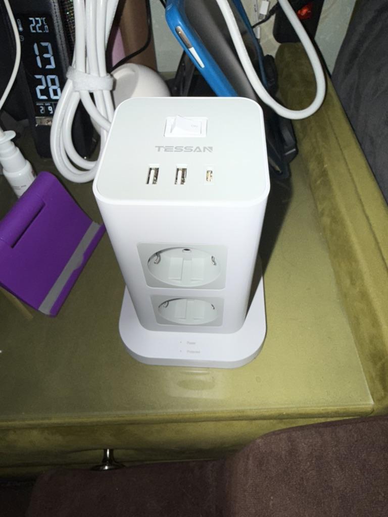 Tessan Tower 8 Way Outlets Socket Multi Power Strip Vertical 2m Extension Cord EU Plug with 3 USB Surge Protector Switch