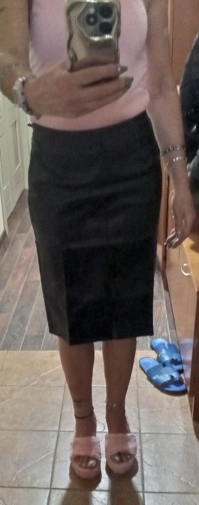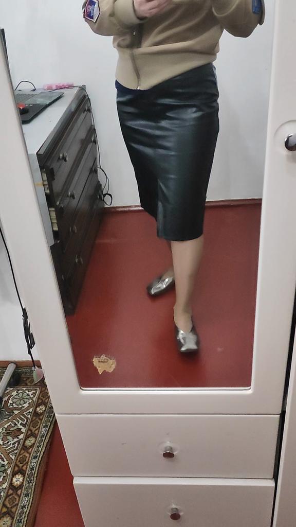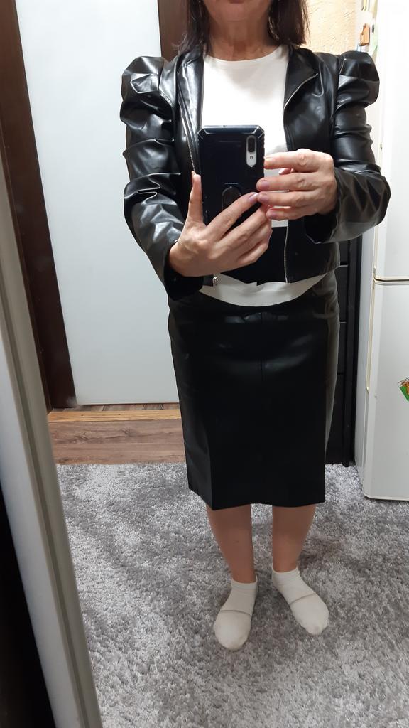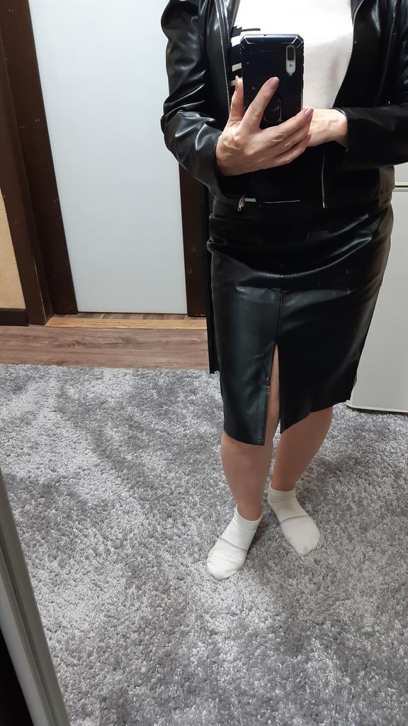 The perfect fitted skirt with a high waist and a slit in the front. It's made of faux leather and creates an unrivaled look. It's a shame it's only knee-length, I wish it was longer, but it still looks great.