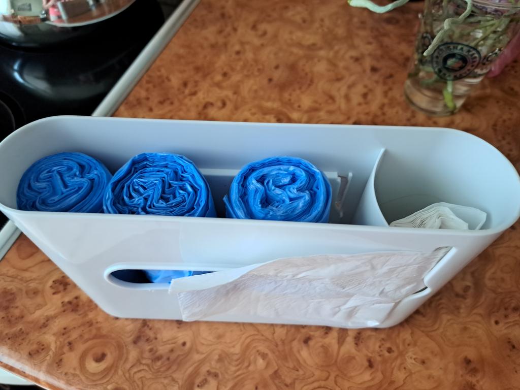 The kitchen trash bag organizer is perfectly glued to the door under the sink. However, it is difficult to tear the trash bag off the common roll.