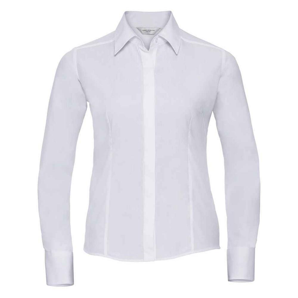 - Back Darts, Bust Darts, Concealed Placket, Easy-Care, Front Darts, Self-Colored Buttons.
