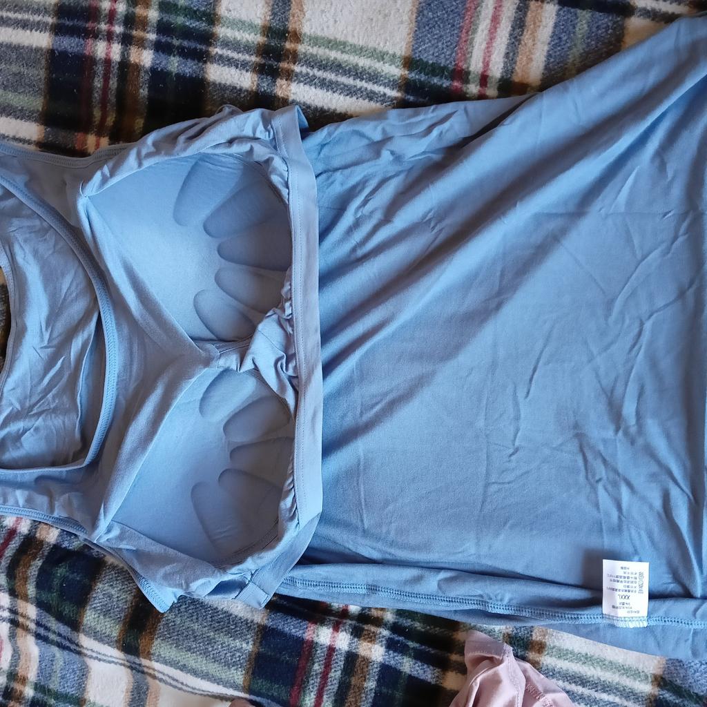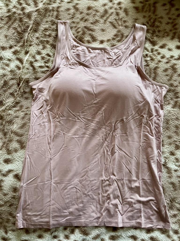 Tank top with inner top. Comfortable, good quality. Polyester composition. Not for large breasts.
