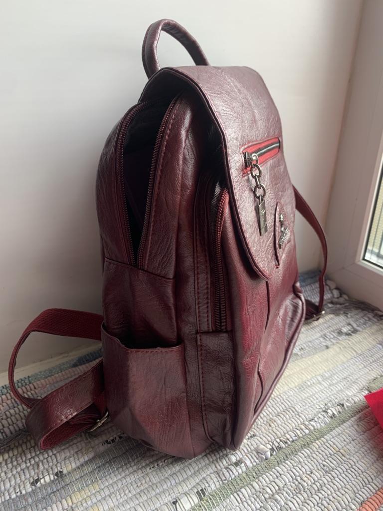 The backpack is very nice, the color is red-burgundy, it looks expensive. The quality is good. I recommend it!