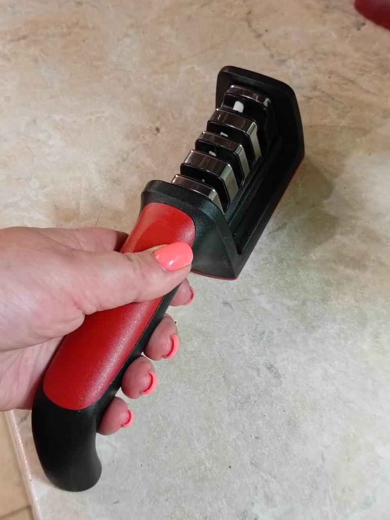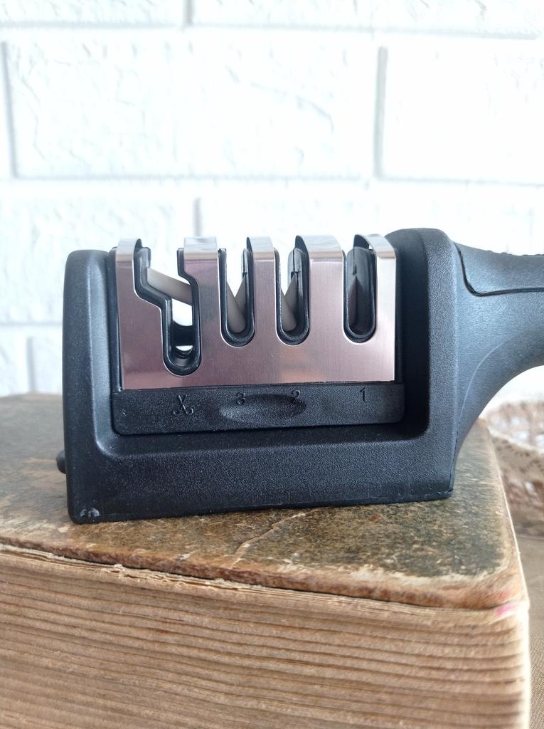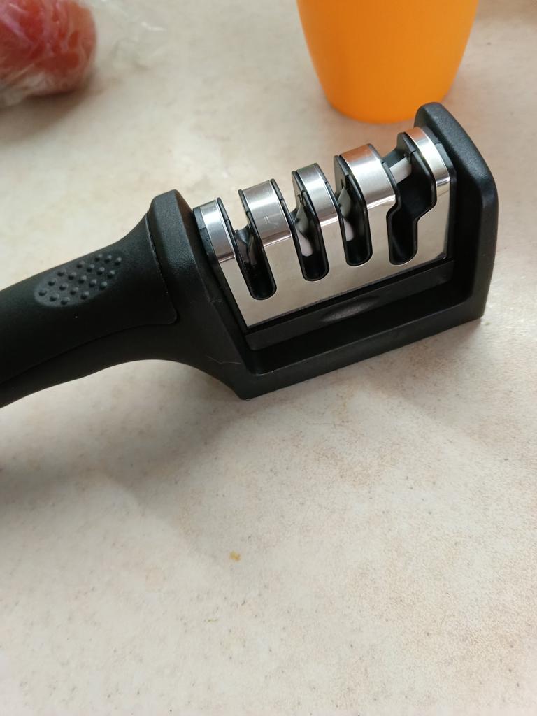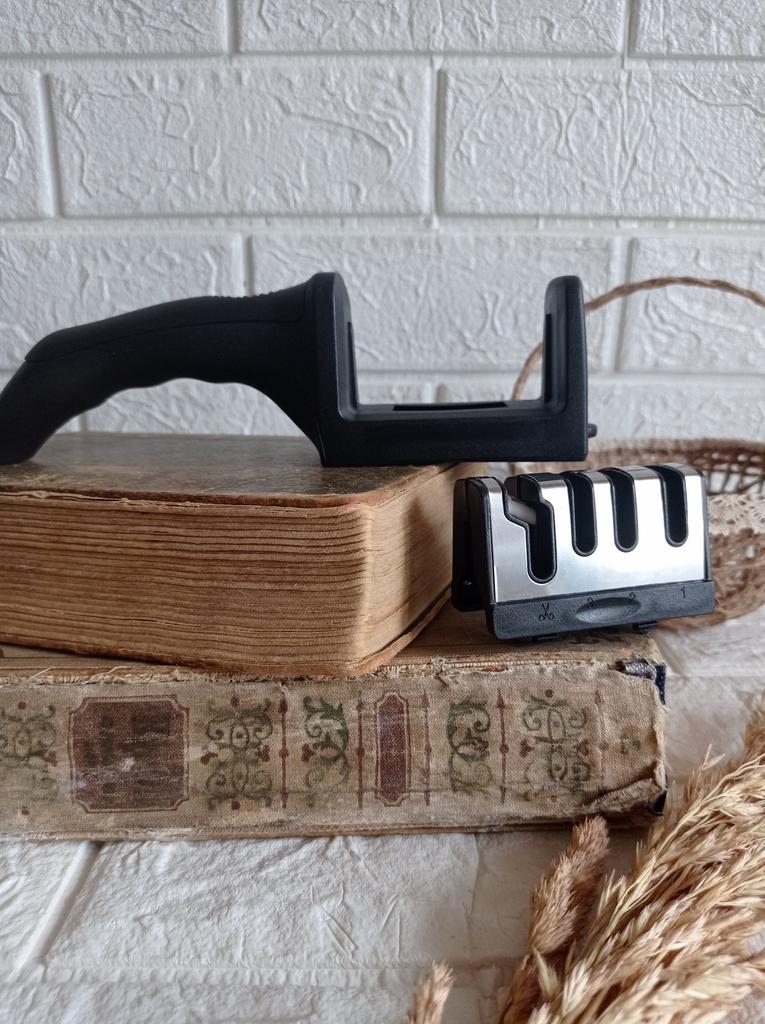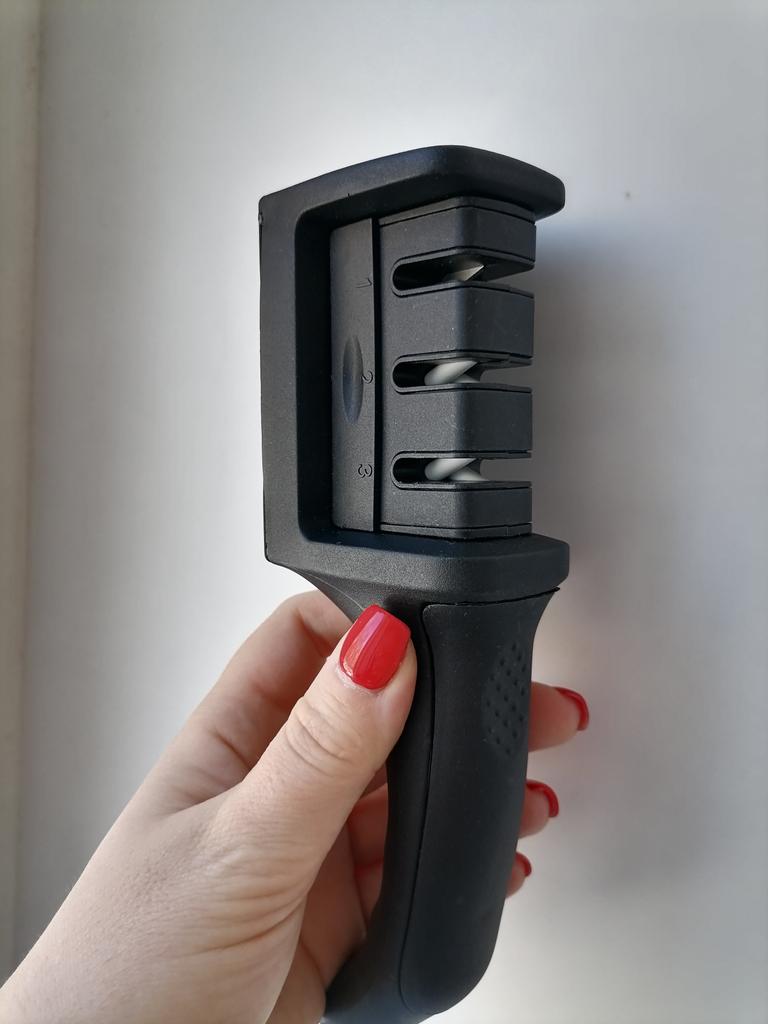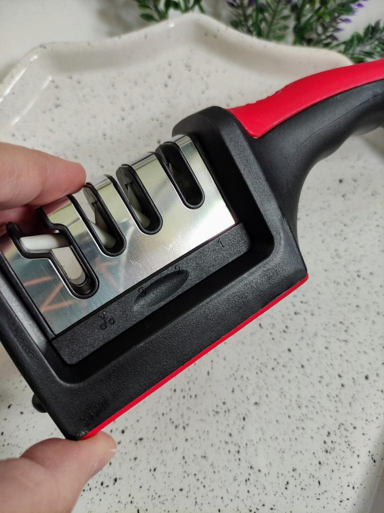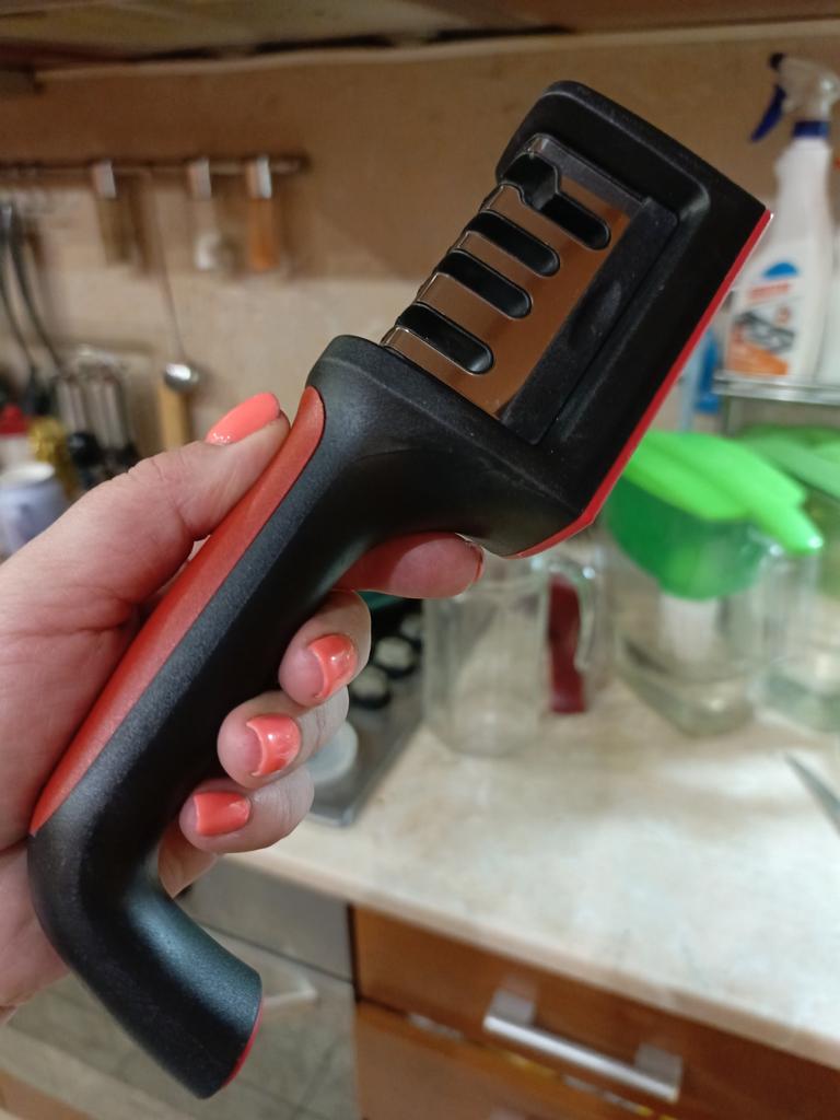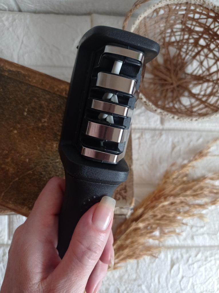 Manual knife sharpener I ordered this for my grandmother. And she asked me to order two more for her girlfriends. This sharpener has three sharpening levels. And in the store you can buy with four. These are sharpeners that have a fourth groove for sharpening scissors. And I will show it to you today too. Three different grooves are responsible for three types of sharpening: sharpening, sharpening with removal of irregularities from the surface, if any (usually on old knives) and polishing. Housing made of ABS plastic. The previous sharpener had a light, subtle smell. These two that I ordered this time have a more pronounced unpleasant odor. The sharpener is equipped with an ergonomic handle and anti-slip rubber pads. It is really comfortable to hold in your hand and does not slip on the surface.. There is also a retractable hole for hanging on a thin hook.. I showed everything in the photo. Size 21*5*6.4 cm There are no instructions for proper use. But everything is simple here. You need to install the sharpener so that the side with the numbers under the grooves is facing you. The knife needs to be placed in the groove and made several movements towards you. No need to press hard, do it gently. I can recommend it if the smell doesn't bother you.