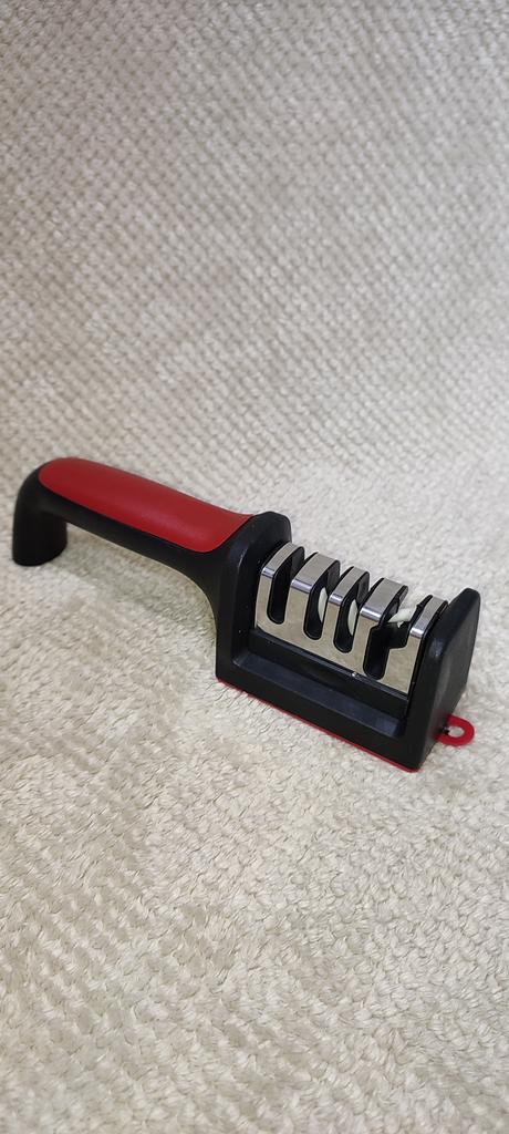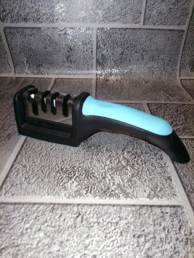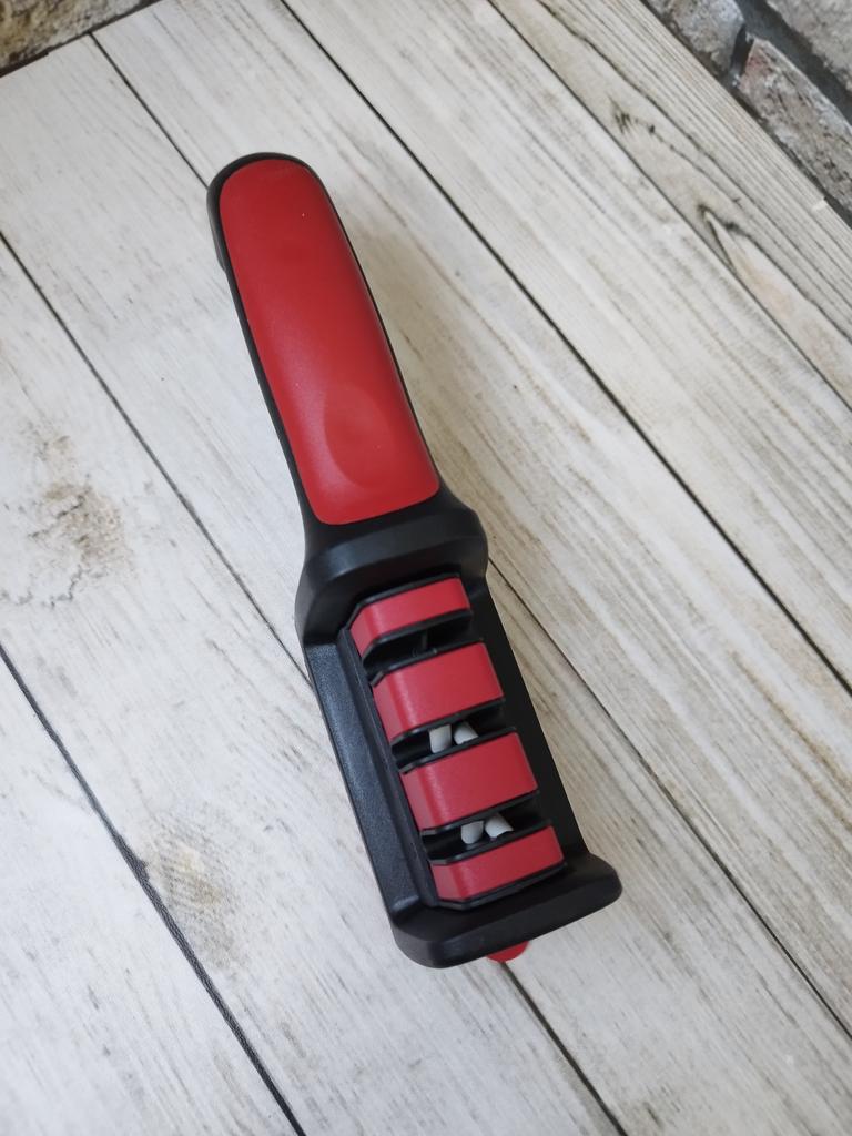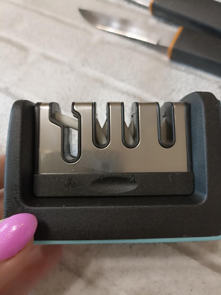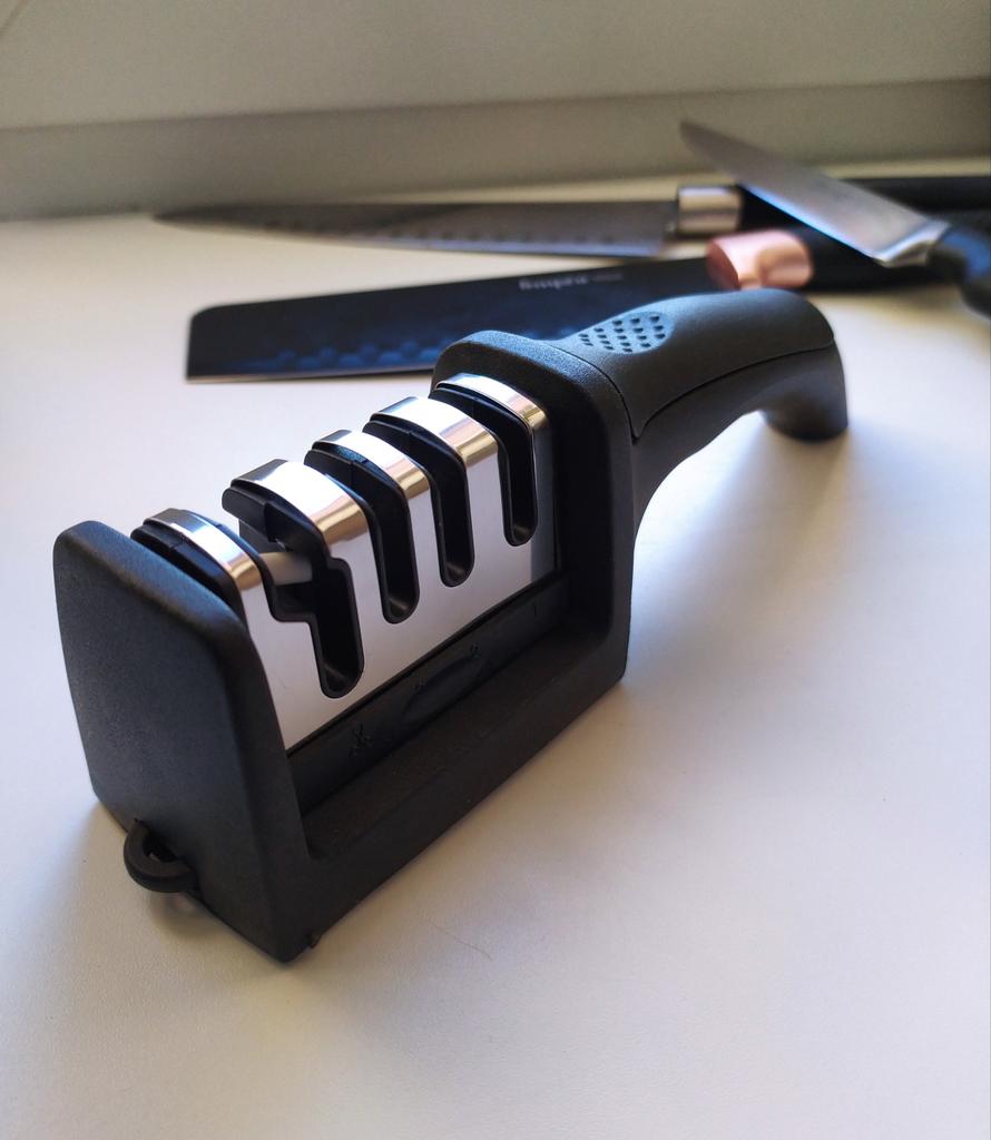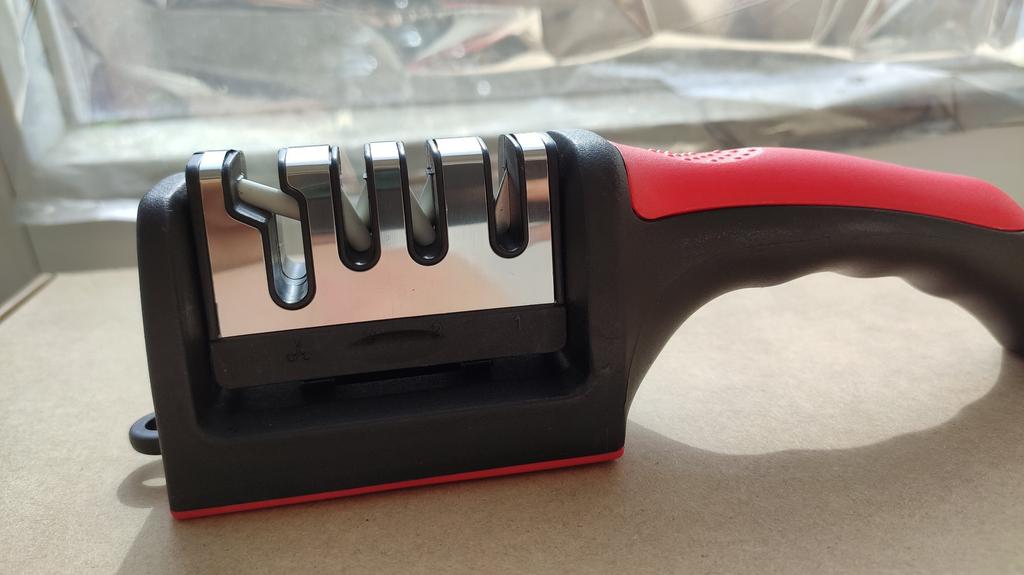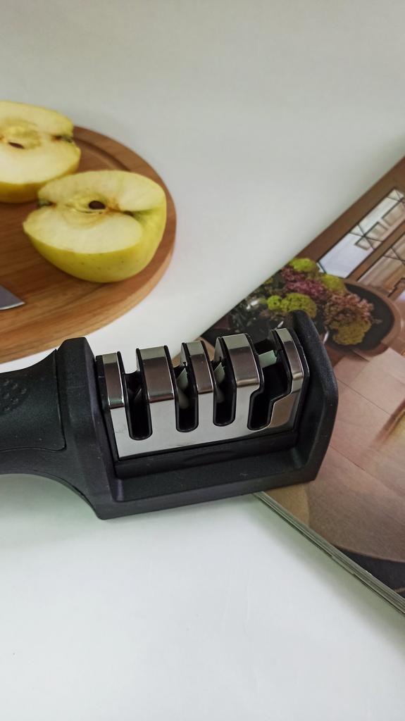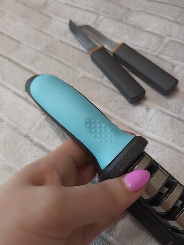 Manual knife sharpener I ordered this for my grandmother. And she asked me to order two more for her girlfriends. This sharpener has three sharpening levels. And in the store you can buy with four. These are sharpeners that have a fourth groove for sharpening scissors. And I will show it to you today too. Three different grooves are responsible for three types of sharpening: sharpening, sharpening with removal of irregularities from the surface, if any (usually on old knives) and polishing. Housing made of ABS plastic. The previous sharpener had a light, subtle smell. These two that I ordered this time have a more pronounced unpleasant odor. The sharpener is equipped with an ergonomic handle and anti-slip rubber pads. It is really comfortable to hold in your hand and does not slip on the surface.. There is also a retractable hole for hanging on a thin hook.. I showed everything in the photo. Size 21*5*6.4 cm There are no instructions for proper use. But everything is simple here. You need to install the sharpener so that the side with the numbers under the grooves is facing you. The knife needs to be placed in the groove and made several movements towards you. No need to press hard, do it gently. I can recommend it if the smell doesn't bother you.