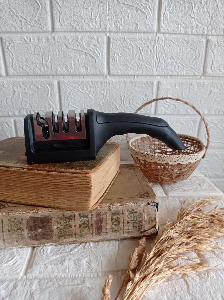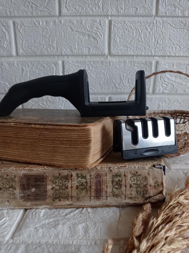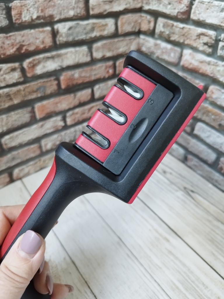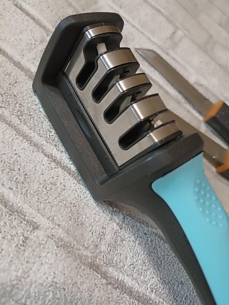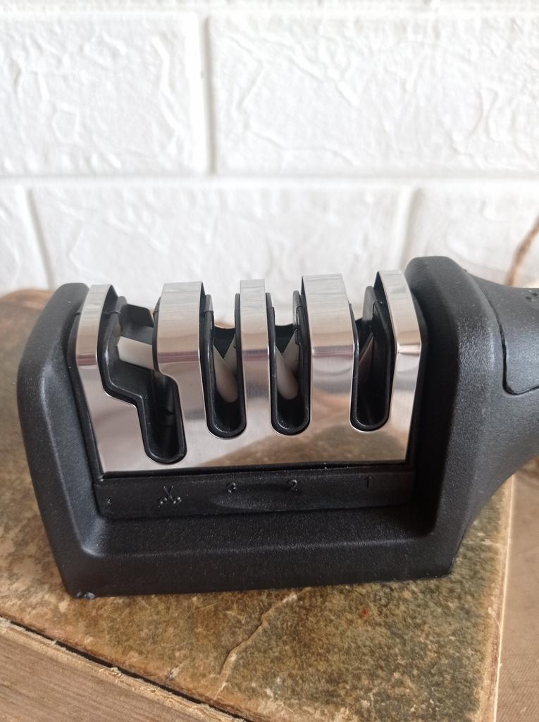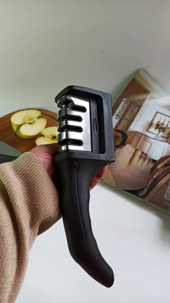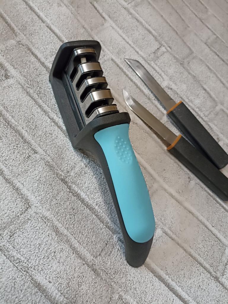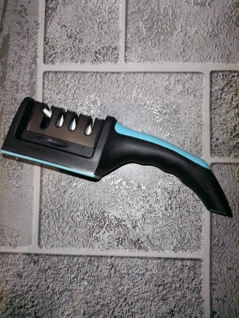 Manual knife sharpener I ordered this for my grandmother. And she asked me to order two more for her girlfriends. This sharpener has three sharpening levels. And in the store you can buy with four. These are sharpeners that have a fourth groove for sharpening scissors. And I will show it to you today too. Three different grooves are responsible for three types of sharpening: sharpening, sharpening with removal of irregularities from the surface, if any (usually on old knives) and polishing. Housing made of ABS plastic. The previous sharpener had a light, subtle smell. These two that I ordered this time have a more pronounced unpleasant odor. The sharpener is equipped with an ergonomic handle and anti-slip rubber pads. It is really comfortable to hold in your hand and does not slip on the surface.. There is also a retractable hole for hanging on a thin hook.. I showed everything in the photo. Size 21*5*6.4 cm There are no instructions for proper use. But everything is simple here. You need to install the sharpener so that the side with the numbers under the grooves is facing you. The knife needs to be placed in the groove and made several movements towards you. No need to press hard, do it gently. I can recommend it if the smell doesn't bother you.