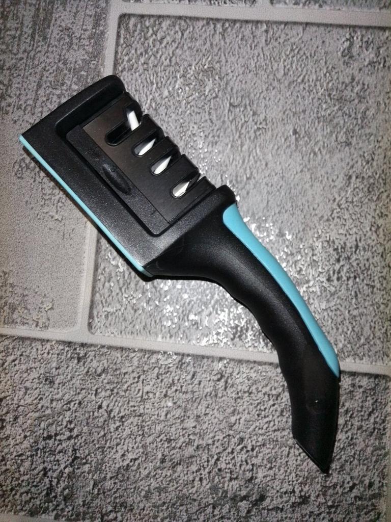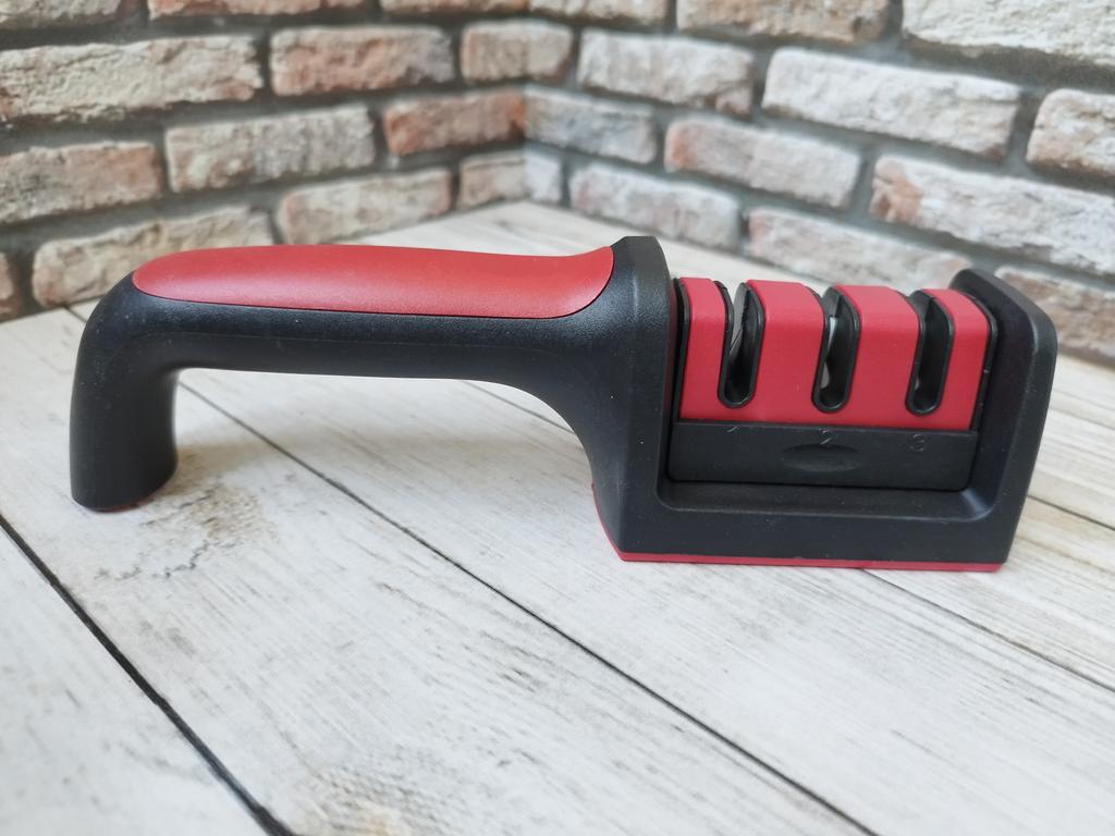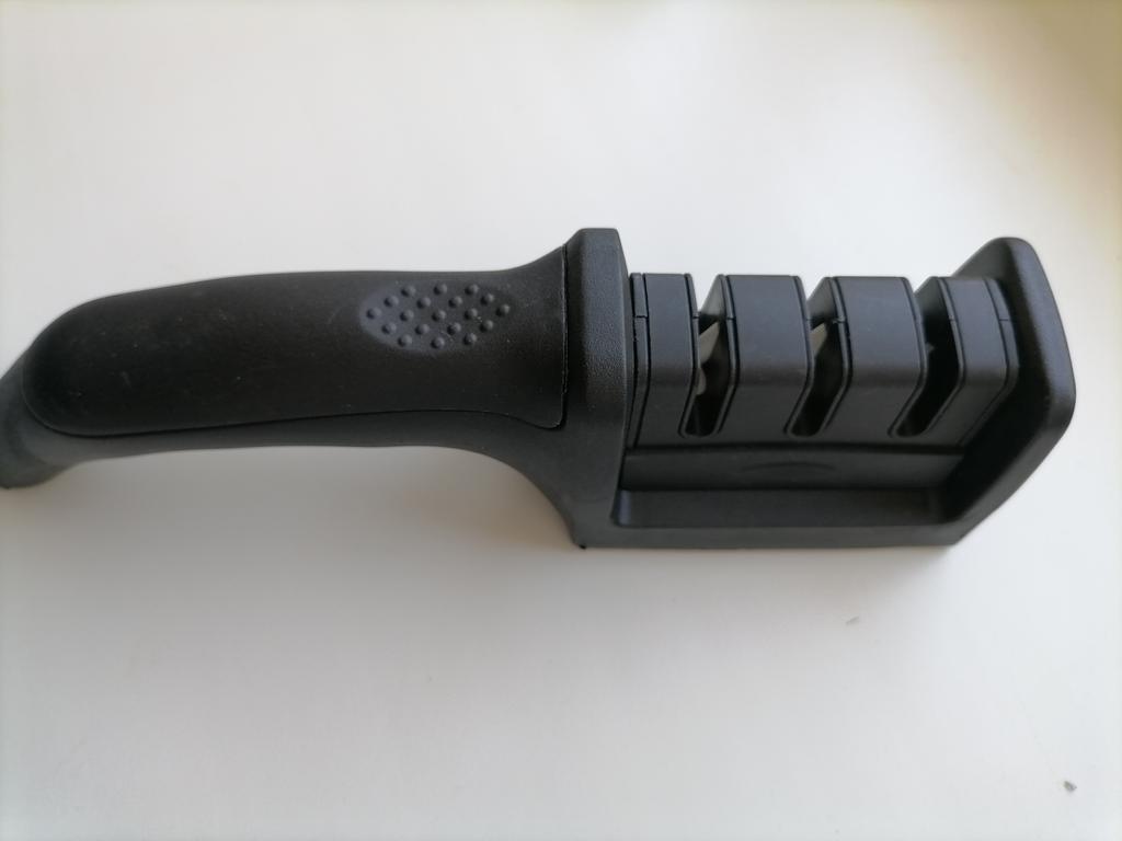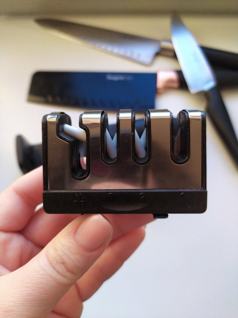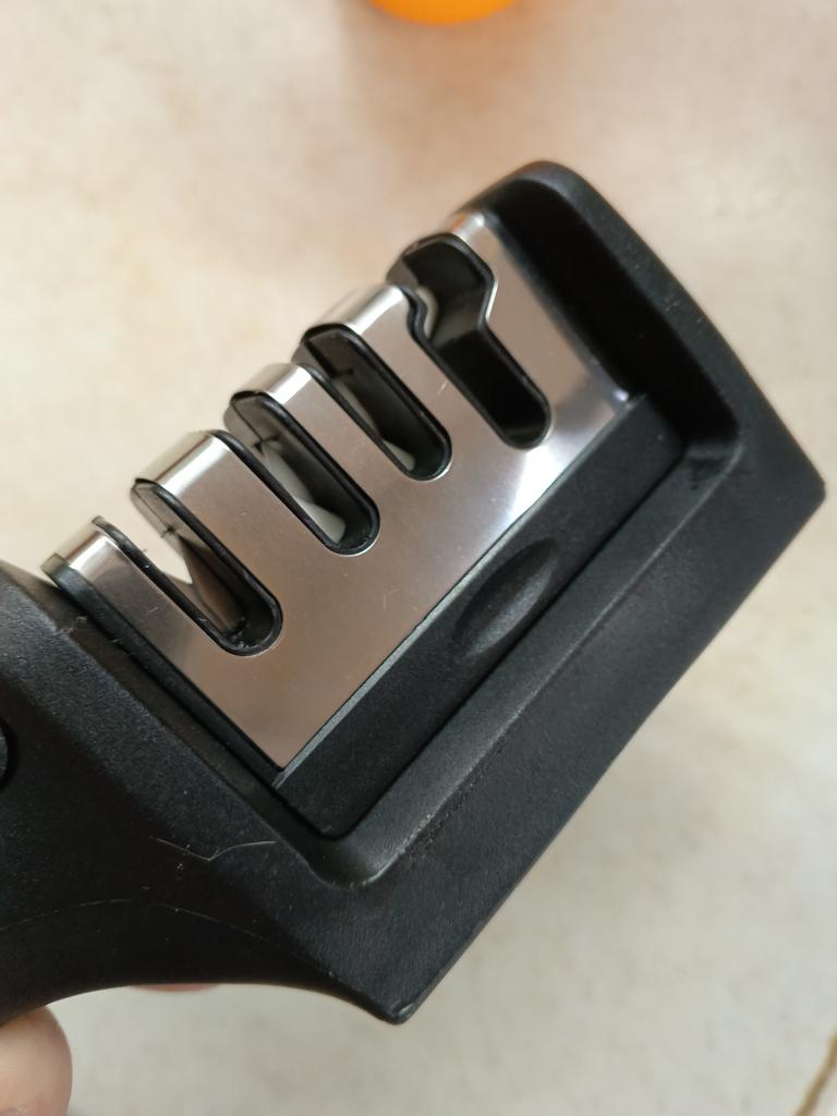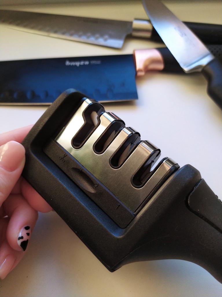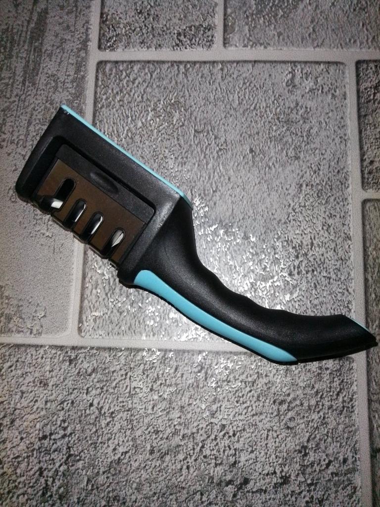 Manual knife sharpener I ordered this for my grandmother. And she asked me to order two more for her girlfriends. This sharpener has three sharpening levels. And in the store you can buy with four. These are sharpeners that have a fourth groove for sharpening scissors. And I will show it to you today too. Three different grooves are responsible for three types of sharpening: sharpening, sharpening with removal of irregularities from the surface, if any (usually on old knives) and polishing. Housing made of ABS plastic. The previous sharpener had a light, subtle smell. These two that I ordered this time have a more pronounced unpleasant odor. The sharpener is equipped with an ergonomic handle and anti-slip rubber pads. It is really comfortable to hold in your hand and does not slip on the surface.. There is also a retractable hole for hanging on a thin hook.. I showed everything in the photo. Size 21*5*6.4 cm There are no instructions for proper use. But everything is simple here. You need to install the sharpener so that the side with the numbers under the grooves is facing you. The knife needs to be placed in the groove and made several movements towards you. No need to press hard, do it gently. I can recommend it if the smell doesn't bother you.