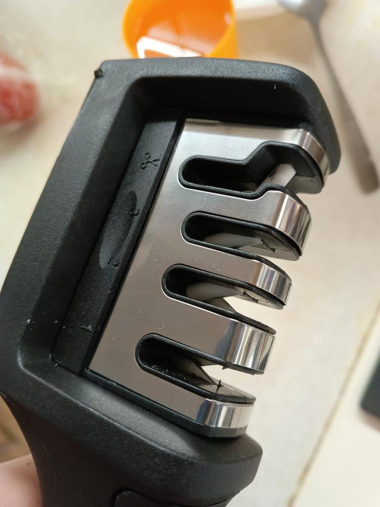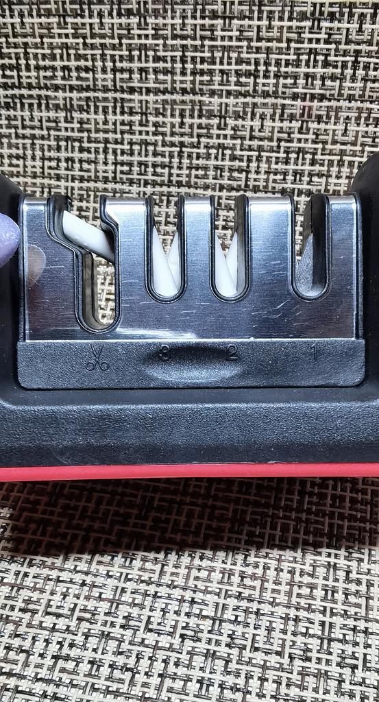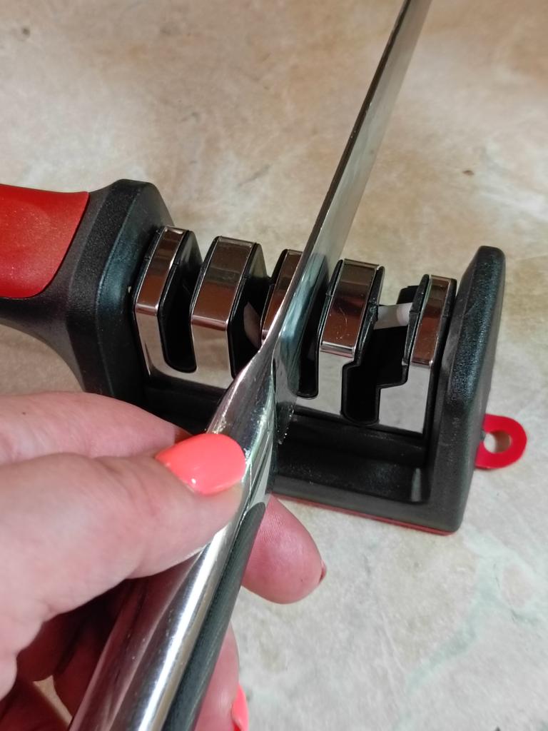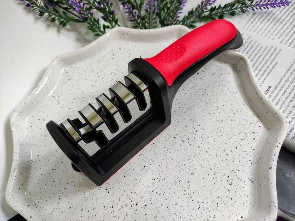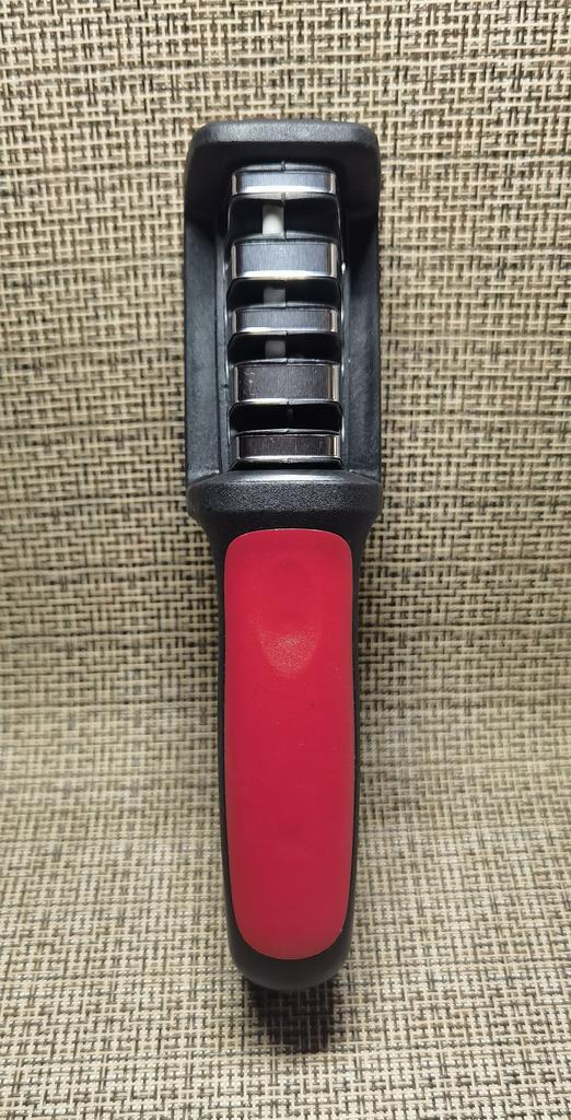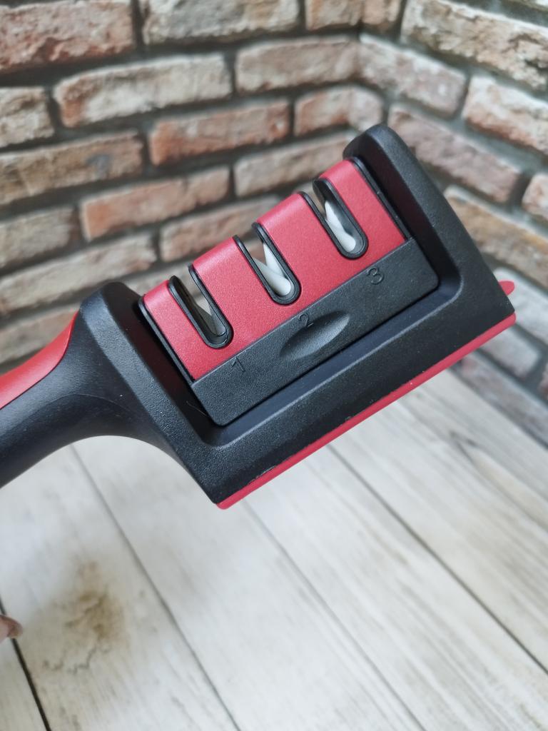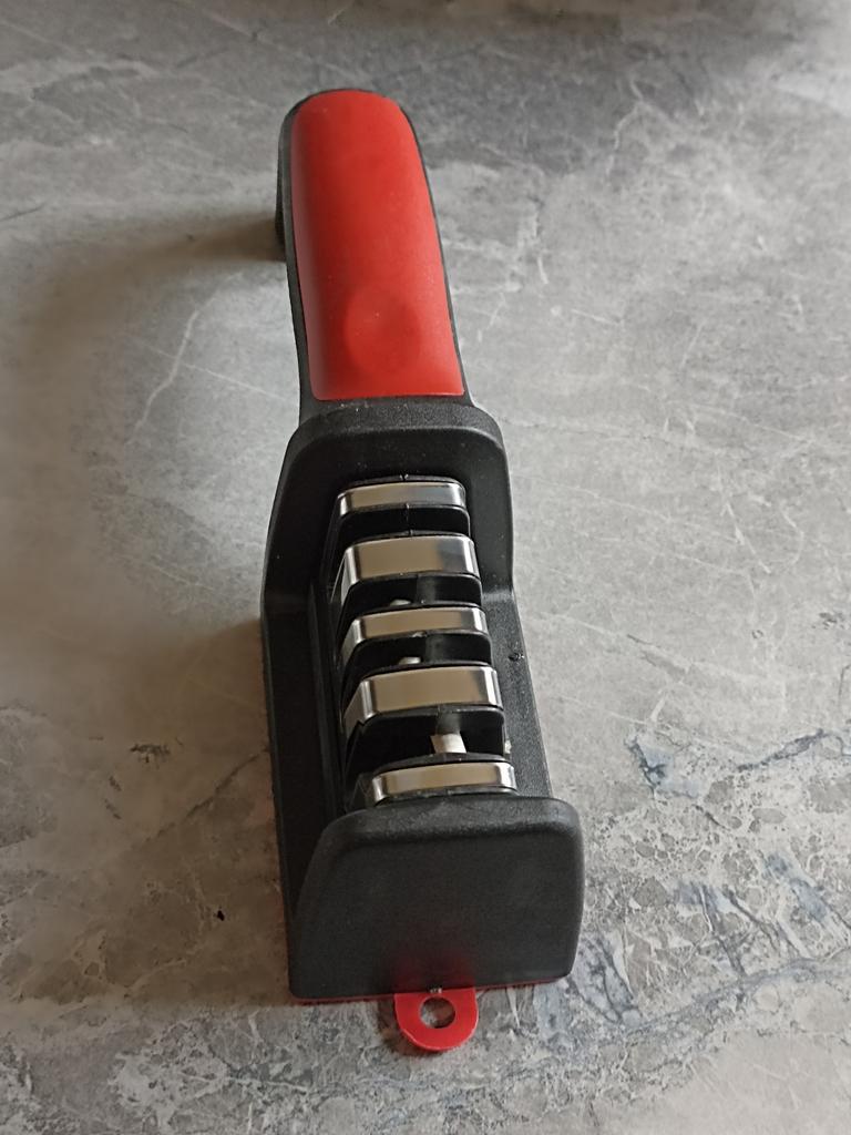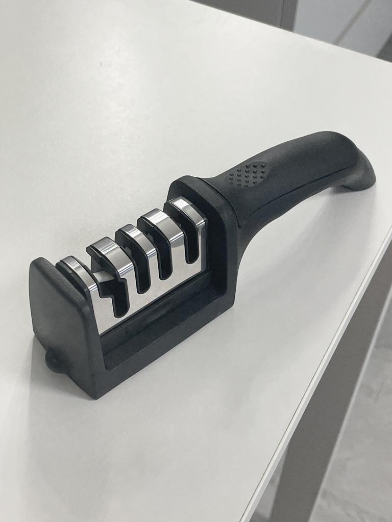 Manual knife sharpener I ordered this for my grandmother. And she asked me to order two more for her girlfriends. This sharpener has three sharpening levels. And in the store you can buy with four. These are sharpeners that have a fourth groove for sharpening scissors. And I will show it to you today too. Three different grooves are responsible for three types of sharpening: sharpening, sharpening with removal of irregularities from the surface, if any (usually on old knives) and polishing. Housing made of ABS plastic. The previous sharpener had a light, subtle smell. These two that I ordered this time have a more pronounced unpleasant odor. The sharpener is equipped with an ergonomic handle and anti-slip rubber pads. It is really comfortable to hold in your hand and does not slip on the surface.. There is also a retractable hole for hanging on a thin hook.. I showed everything in the photo. Size 21*5*6.4 cm There are no instructions for proper use. But everything is simple here. You need to install the sharpener so that the side with the numbers under the grooves is facing you. The knife needs to be placed in the groove and made several movements towards you. No need to press hard, do it gently. I can recommend it if the smell doesn't bother you.
