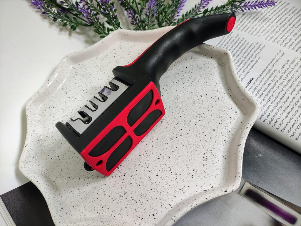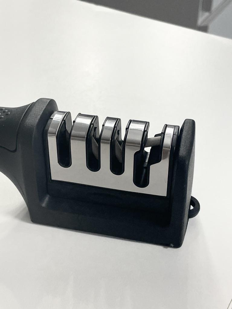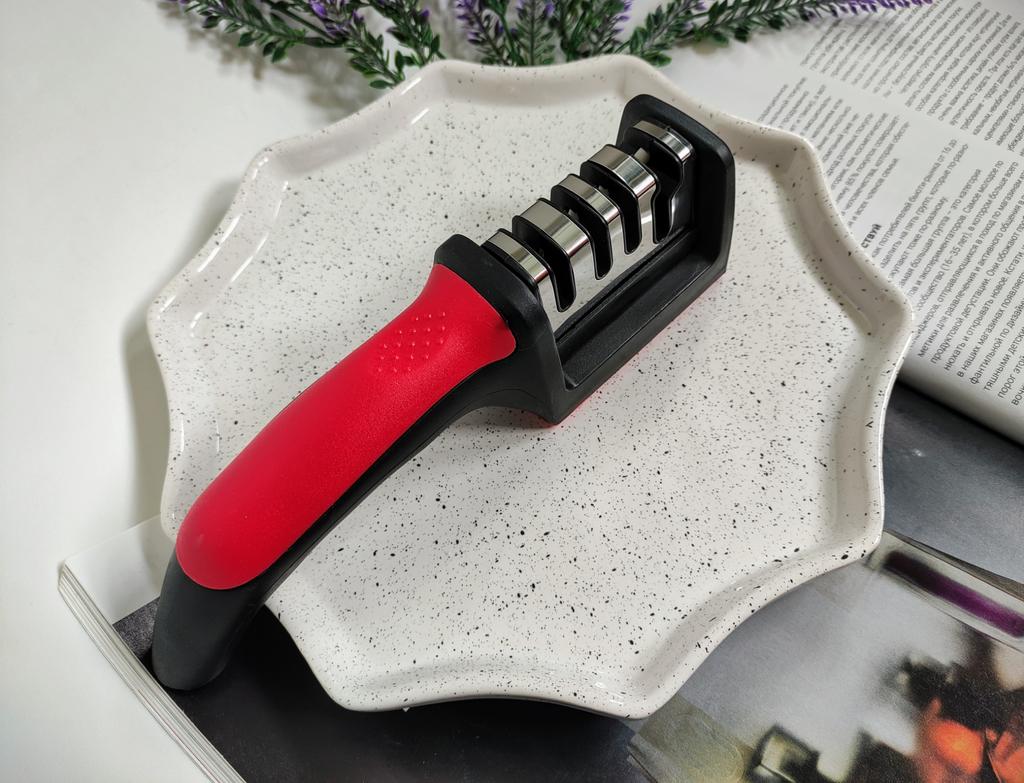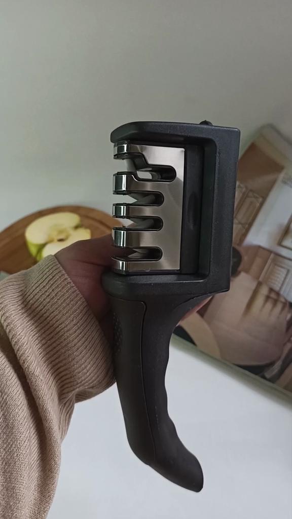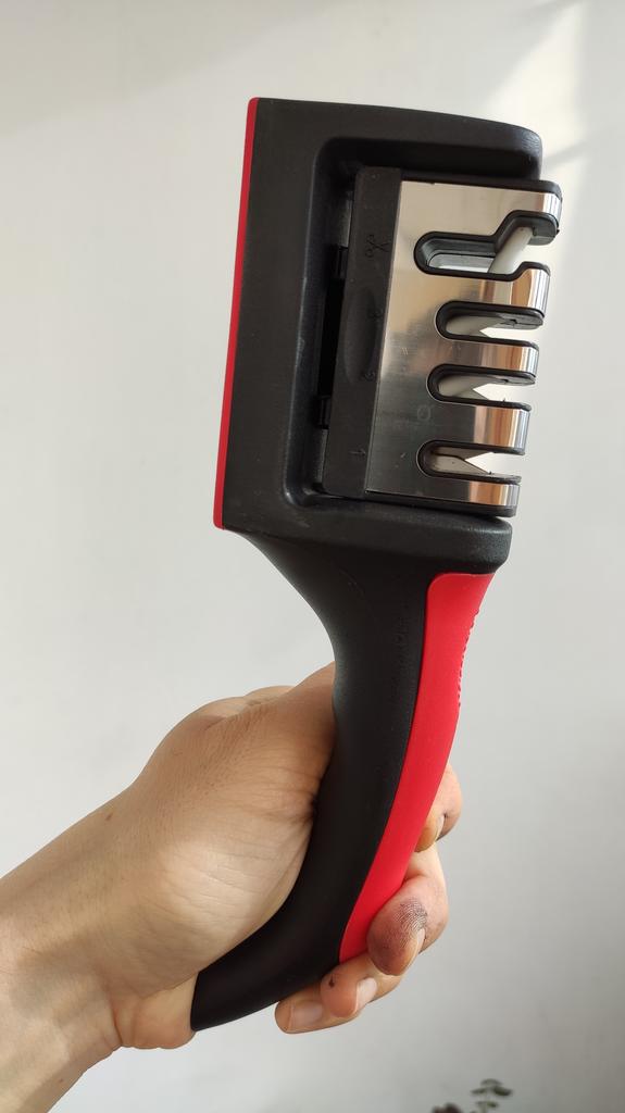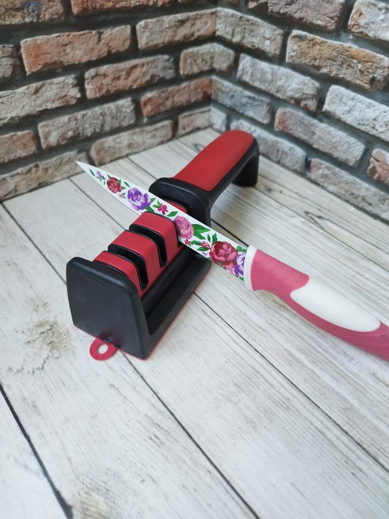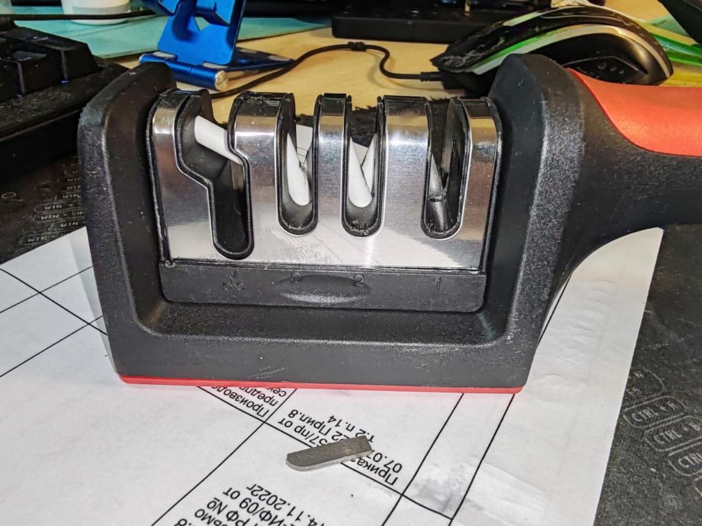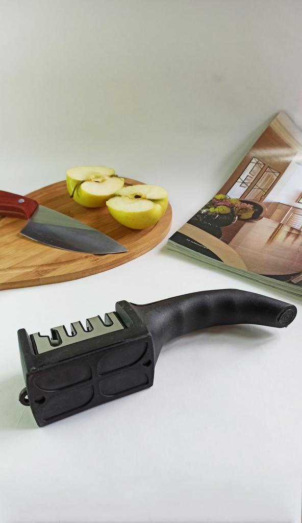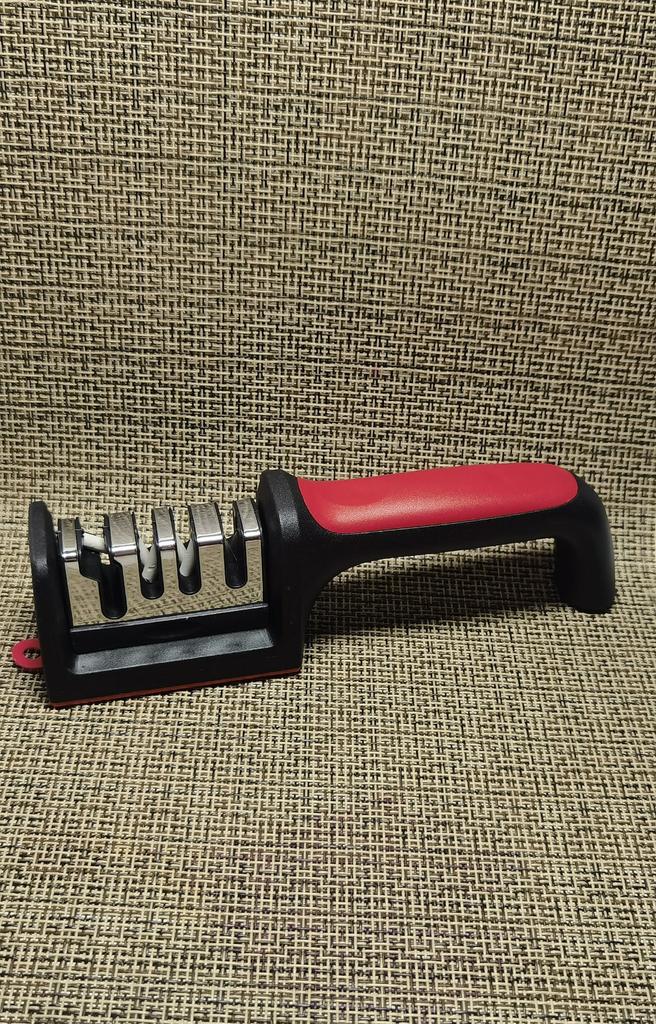 Manual knife sharpener I ordered this for my grandmother. And she asked me to order two more for her girlfriends. This sharpener has three sharpening levels. And in the store you can buy with four. These are sharpeners that have a fourth groove for sharpening scissors. And I will show it to you today too. Three different grooves are responsible for three types of sharpening: sharpening, sharpening with removal of irregularities from the surface, if any (usually on old knives) and polishing. Housing made of ABS plastic. The previous sharpener had a light, subtle smell. These two that I ordered this time have a more pronounced unpleasant odor. The sharpener is equipped with an ergonomic handle and anti-slip rubber pads. It is really comfortable to hold in your hand and does not slip on the surface.. There is also a retractable hole for hanging on a thin hook.. I showed everything in the photo. Size 21*5*6.4 cm There are no instructions for proper use. But everything is simple here. You need to install the sharpener so that the side with the numbers under the grooves is facing you. The knife needs to be placed in the groove and made several movements towards you. No need to press hard, do it gently. I can recommend it if the smell doesn't bother you.
