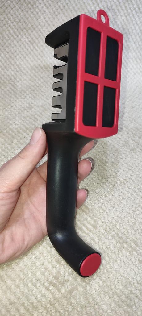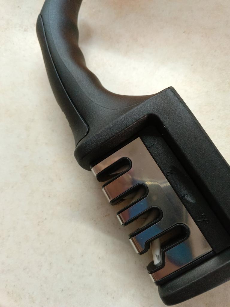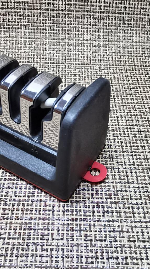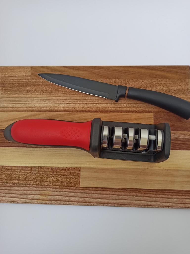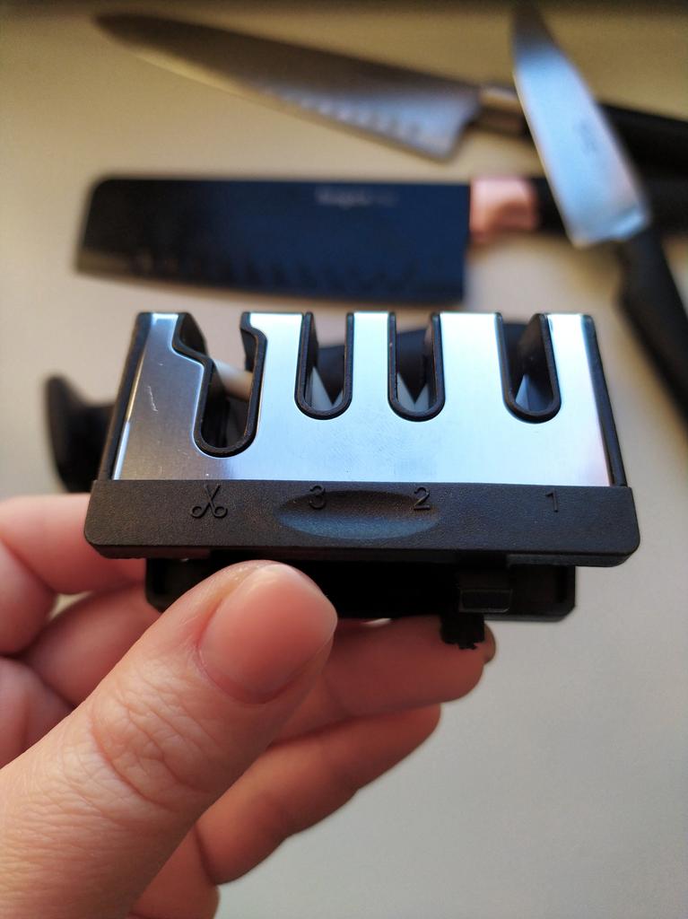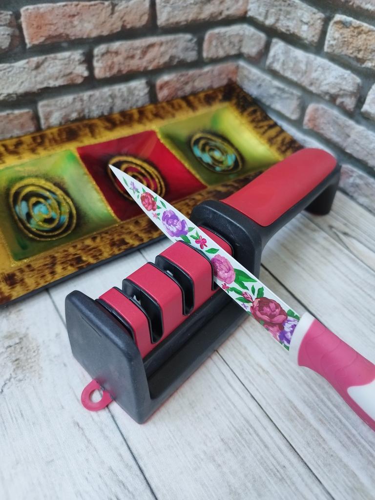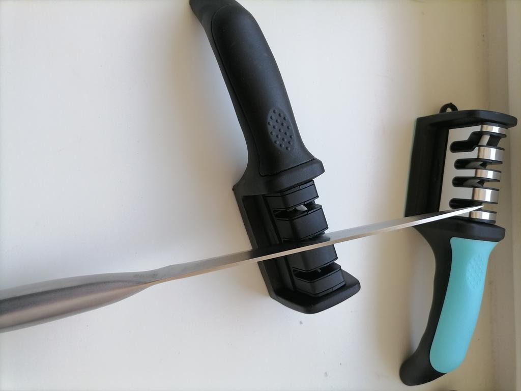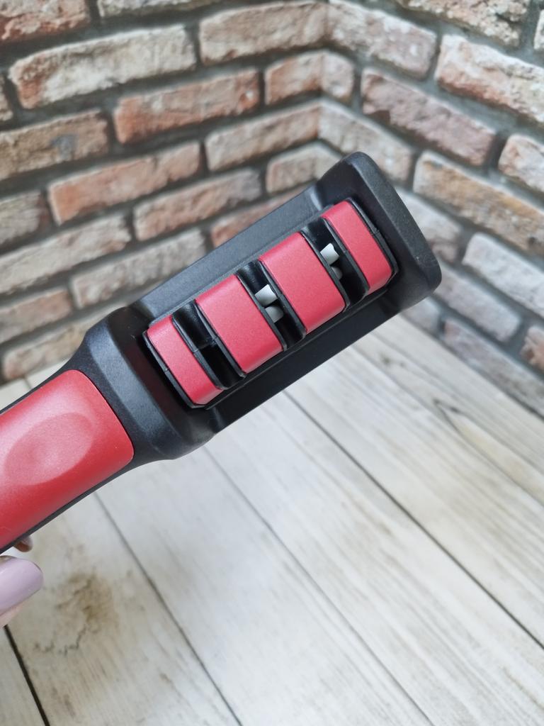 Manual knife sharpener I ordered this for my grandmother. And she asked me to order two more for her girlfriends. This sharpener has three sharpening levels. And in the store you can buy with four. These are sharpeners that have a fourth groove for sharpening scissors. And I will show it to you today too. Three different grooves are responsible for three types of sharpening: sharpening, sharpening with removal of irregularities from the surface, if any (usually on old knives) and polishing. Housing made of ABS plastic. The previous sharpener had a light, subtle smell. These two that I ordered this time have a more pronounced unpleasant odor. The sharpener is equipped with an ergonomic handle and anti-slip rubber pads. It is really comfortable to hold in your hand and does not slip on the surface.. There is also a retractable hole for hanging on a thin hook.. I showed everything in the photo. Size 21*5*6.4 cm There are no instructions for proper use. But everything is simple here. You need to install the sharpener so that the side with the numbers under the grooves is facing you. The knife needs to be placed in the groove and made several movements towards you. No need to press hard, do it gently. I can recommend it if the smell doesn't bother you.