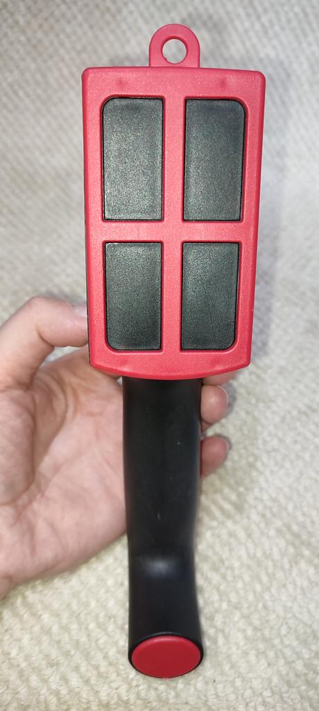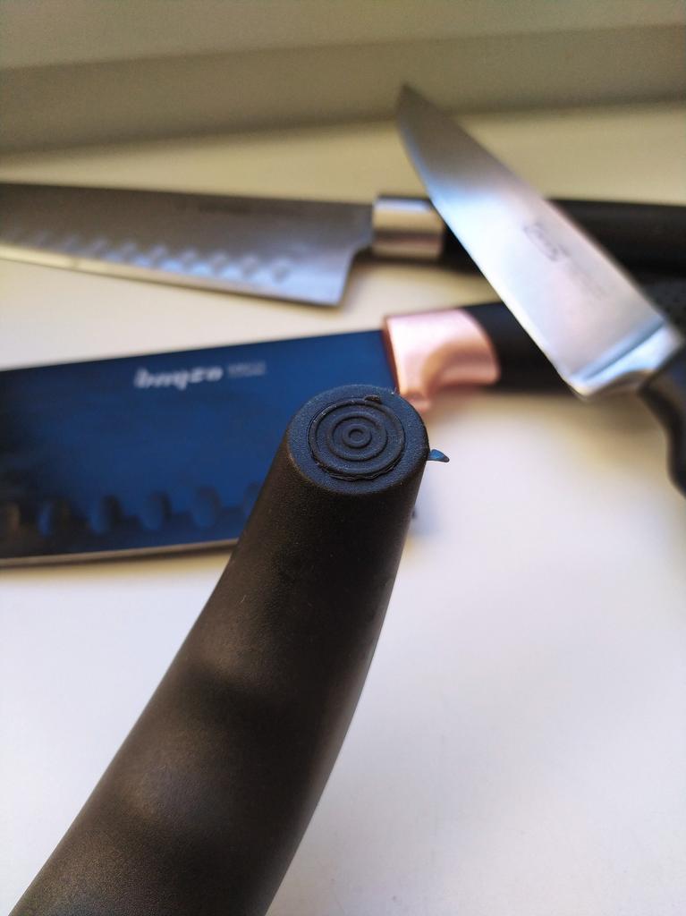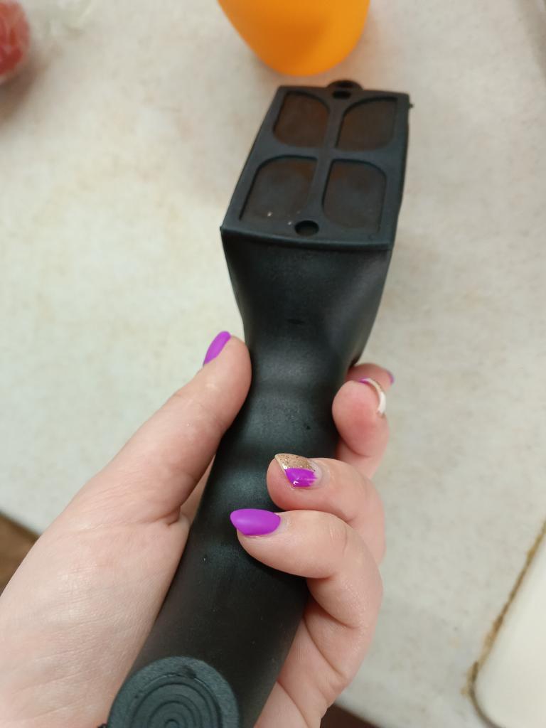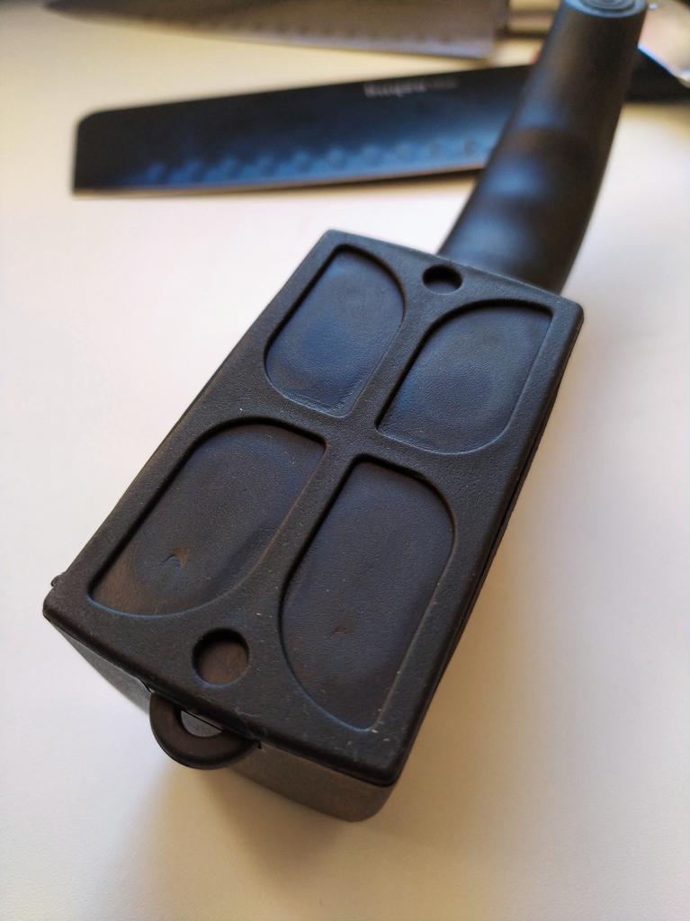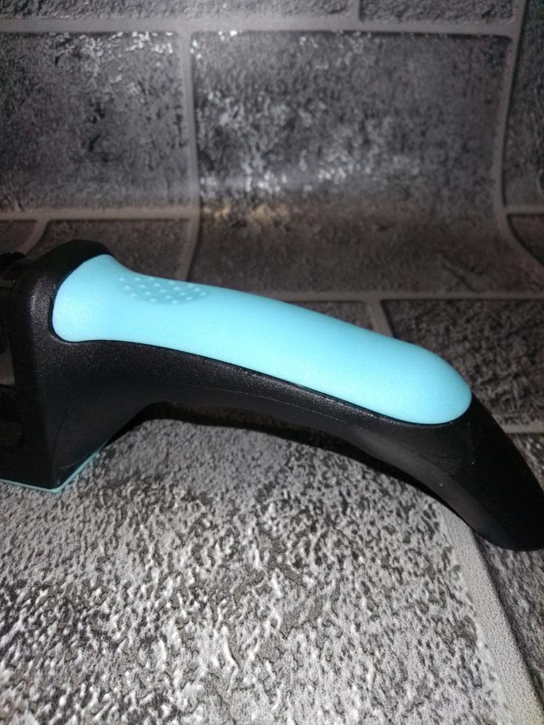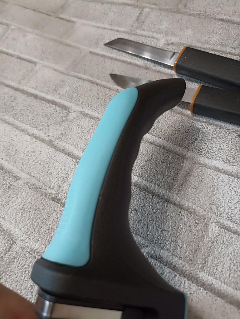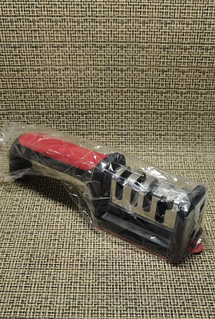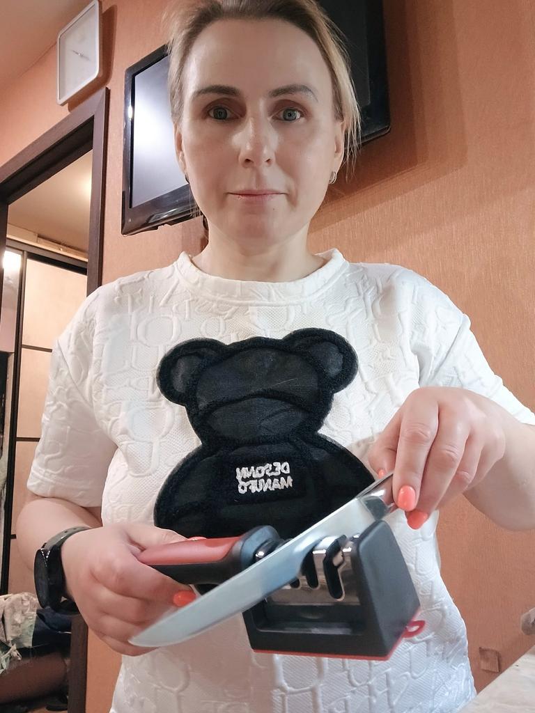 Manual knife sharpener I ordered this for my grandmother. And she asked me to order two more for her girlfriends. This sharpener has three sharpening levels. And in the store you can buy with four. These are sharpeners that have a fourth groove for sharpening scissors. And I will show it to you today too. Three different grooves are responsible for three types of sharpening: sharpening, sharpening with removal of irregularities from the surface, if any (usually on old knives) and polishing. Housing made of ABS plastic. The previous sharpener had a light, subtle smell. These two that I ordered this time have a more pronounced unpleasant odor. The sharpener is equipped with an ergonomic handle and anti-slip rubber pads. It is really comfortable to hold in your hand and does not slip on the surface.. There is also a retractable hole for hanging on a thin hook.. I showed everything in the photo. Size 21*5*6.4 cm There are no instructions for proper use. But everything is simple here. You need to install the sharpener so that the side with the numbers under the grooves is facing you. The knife needs to be placed in the groove and made several movements towards you. No need to press hard, do it gently. I can recommend it if the smell doesn't bother you.