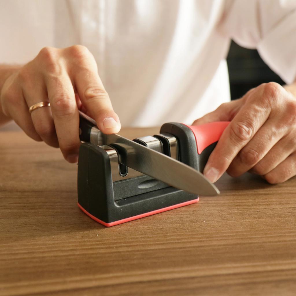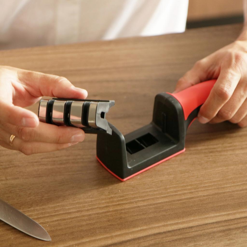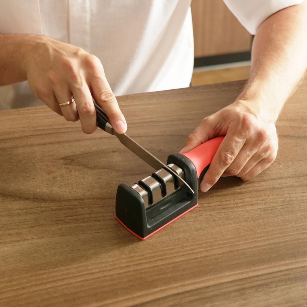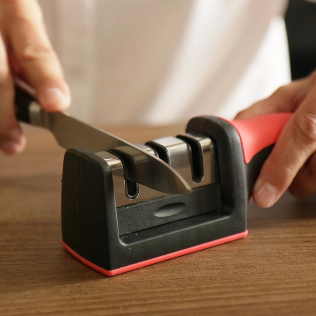 KNIFE SHARPENER the package arrived in Italy with tracked shipping in 12 days. Perfectly packaged, it arrived intact. When knives no longer cut like they used to, what can we do? We discard them and buy new ones or we can sharpen them again. this article allows us to restore them to their original efficiency without spending a lot of money. The handle is ergonomic, ABS material. The grip is firm and secure 3-step sharpening system: 1. coarse, diamond surface slot: for repairing damaged blades 2. tungsten fine: makes the blades sharp again, 3. final ceramic honing: ideal for fine sharpening and polishing. Easy to use Simply place the dull blade in the sharpening slot and gently pull the knife a few times. For correct use, the knife must be positioned and pulled, positioned again and pulled. Do not slide the knife back and forth. Recommended purchase