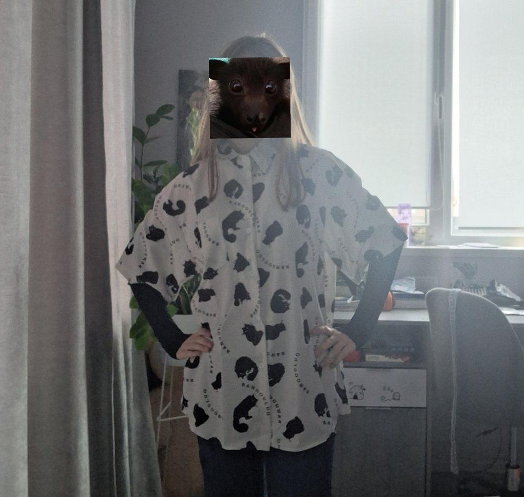 I took a slightly larger size (height 158), the print is well done. The shirt arrived in nice packaging and was not wrinkled. (In the photo, I am wearing black fingerless gloves)