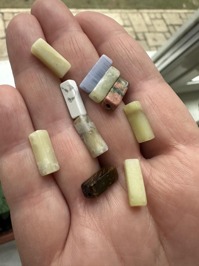 Assortment of small beads in the shape of sticks. The sizes are all different. There are natural stones, there are imitations. They look good, but the different sizes spoil everything.