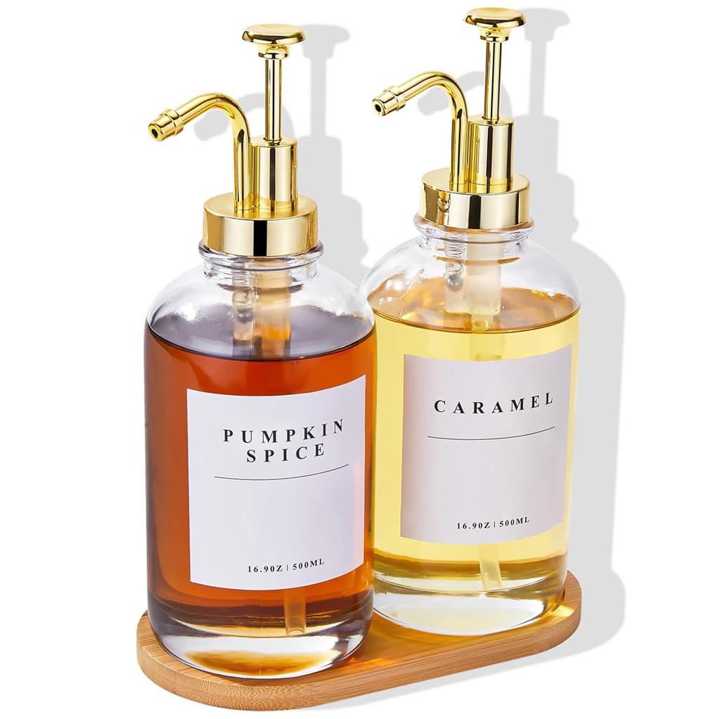 SYRUP DISPENSER SET: Coffee syrup dispenser kit includes 2×16.9 oz (500 ml) high quality glass coffee syrup bottles, 2 metal style PVC pumps, 28 labels, and 1 funnel. This coffee syrup dispenser is the ideal accessory for a coffee bar.