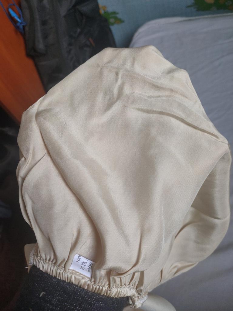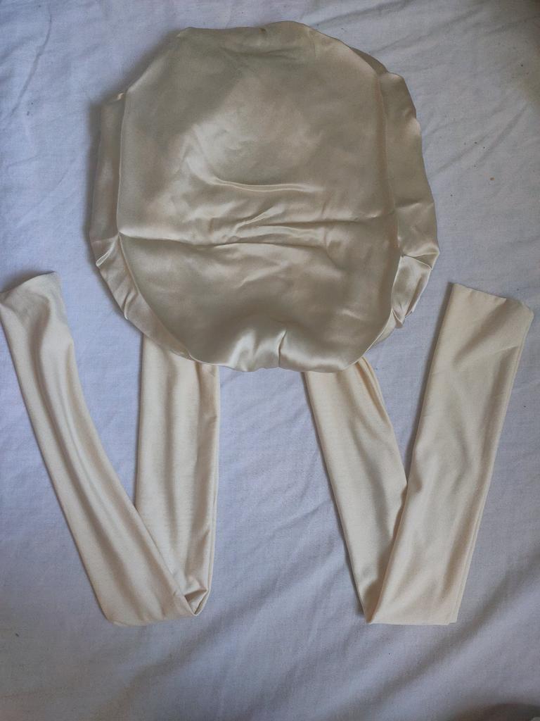 The cap is nice, looks like silk, doesn't electrify at all, soft, comfortable, can be tied to fit any head size